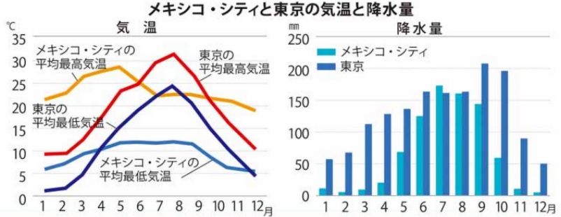 メキシコは北半球にあるので、暑い時期、寒い時期とも日本と同じ。5~10月が雨季となり、11~4月が乾季となる。雨季は昼間に晴れていても夕方に雷雨に遭うというのが一般的だが、低気圧の停滞によって雨が降り続くこともある。また年によってハリケーンが襲来し、カリブ海側やメキシコ湾岸に被害が出るケースもある。