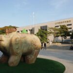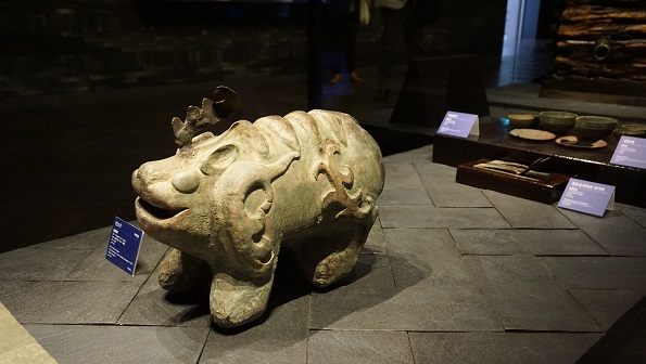 とくに注目したいのは、武寧王陵の入り口に置かれていたというこちらの石獣。魔除けの意図もあったといわれており国宝に指定されています。じっくり眺めるとなんだかとってもかわいいお顔! 博物館入り口前にもこちらをモチーフにした像があったり、公州市のいたるところでイラストを見かけるのですっかり愛着がわいてきます。