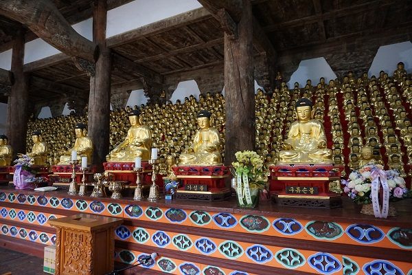 最後は、1000年以上もの歴史をもつこちらも世界遺産のお寺「麻谷寺」。新羅の慈蔵律師が640年に創建したと記録されています。町の中心部からは車で30分とすこし離れていますが、広い敷地内には大雄殿、霊山殿、大寂光殿など重要な建築文化財のほか、たくさんの木々や小川が流れており歩いているだけで気持ちがよい場所で行く価値ありです。なかでも注目したいのは1000体もの仏像がまつられている「霊山殿」。最初に目が合った像の顔が運命の人と似ているといわれており、たくさんの仏像のなかからこれぞという推しに出会う楽しみもあります。お寺の敷地内では春には桜、秋には紅葉も楽しむことができ、韓国の華やかなお寺を絶景とともに楽しめるスポットです。