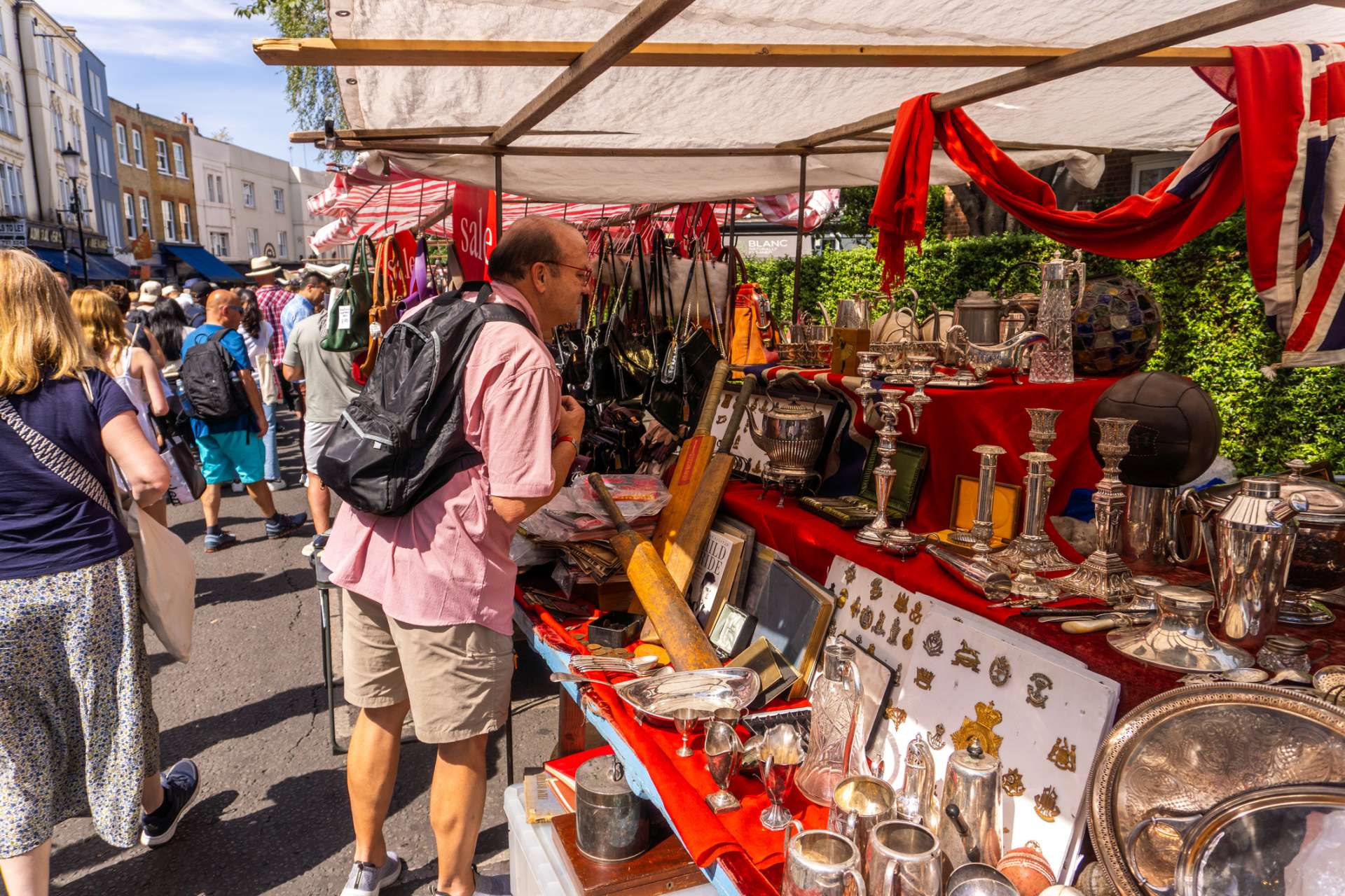 土曜日の朝、ロンドンの地下鉄ノッティング・ヒル・ゲイト駅を降りると、たくさんの人が同じ方角に歩いていきます。その先にあるのが、ロンドン最大のストリート・マーケット、ポートベロー・マーケット。アンティークが多いことで知られていますが、食料品やセカンドハンドなどを売る屋台もたくさん! 通り沿いにはズラリと屋台が並んでいます。アンティークのジュエリーのほか、小さな水彩画や古地図もあって、見て歩くだけでも、とにかく楽しいマーケットなのです。ポートベロー・ロードをどんどん進むと、お待ちかねの食べ物屋台もありますよ。