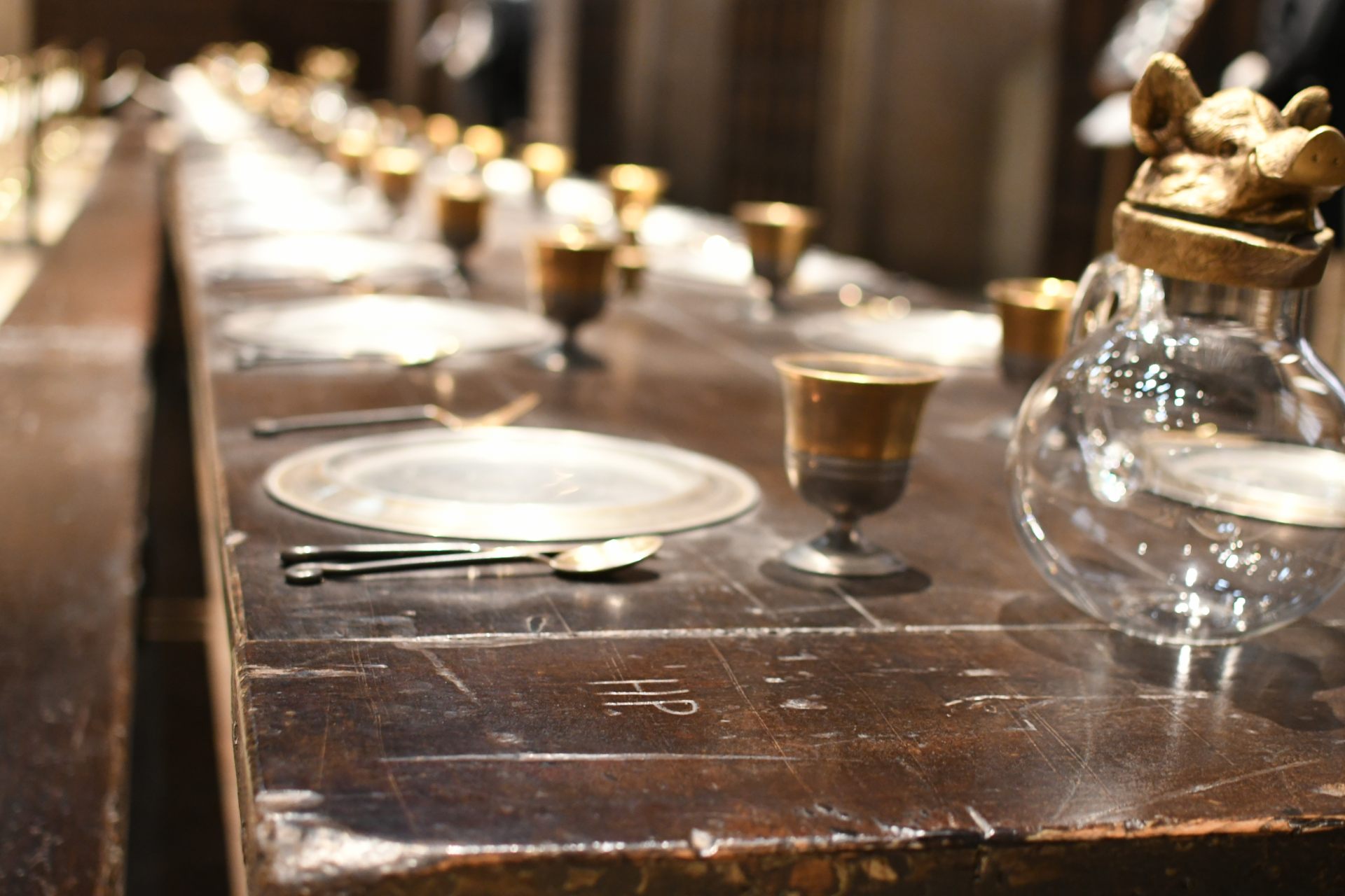 大広間には、グリフィンドール、スリザリン、ハッフルパフ、レイブンクローの各寮生の制服や、正面の教壇にはダンブルドア校長やマクゴナガル先生など教師たちの衣装も展示されています。どれも、当時の役者たちが着用したサイズで再現されているので、映画の世界がよりリアルに感じられます。また、エイジング加工を施したテーブルには、食器なども撮影で使われたものを忠実に再現。テーブルをよく見ると傷跡の中に登場人物のイニシャルが隠れていたり、とにかく芸が細かいので、隅々まで観察したくなります。