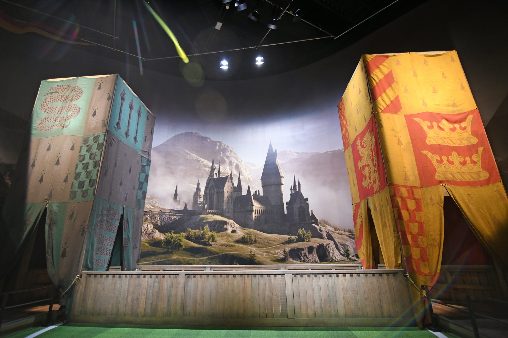最初に訪れたのは、映画で最も重要な場所のひとつであるホグワーツ魔法魔術学校の大広間。組分け儀式をはじめ祝宴やクリスマス・ダンスパーティー、そして魔法対決など、数々の学校行事が行われた場所です。オックスフォード大学のクライスト・チャーチ・カレッジからインスピレーションを得た伝統的な英国建築をベースに、キャンドルが宙に浮かぶ天井などが視覚効果で加えられました。