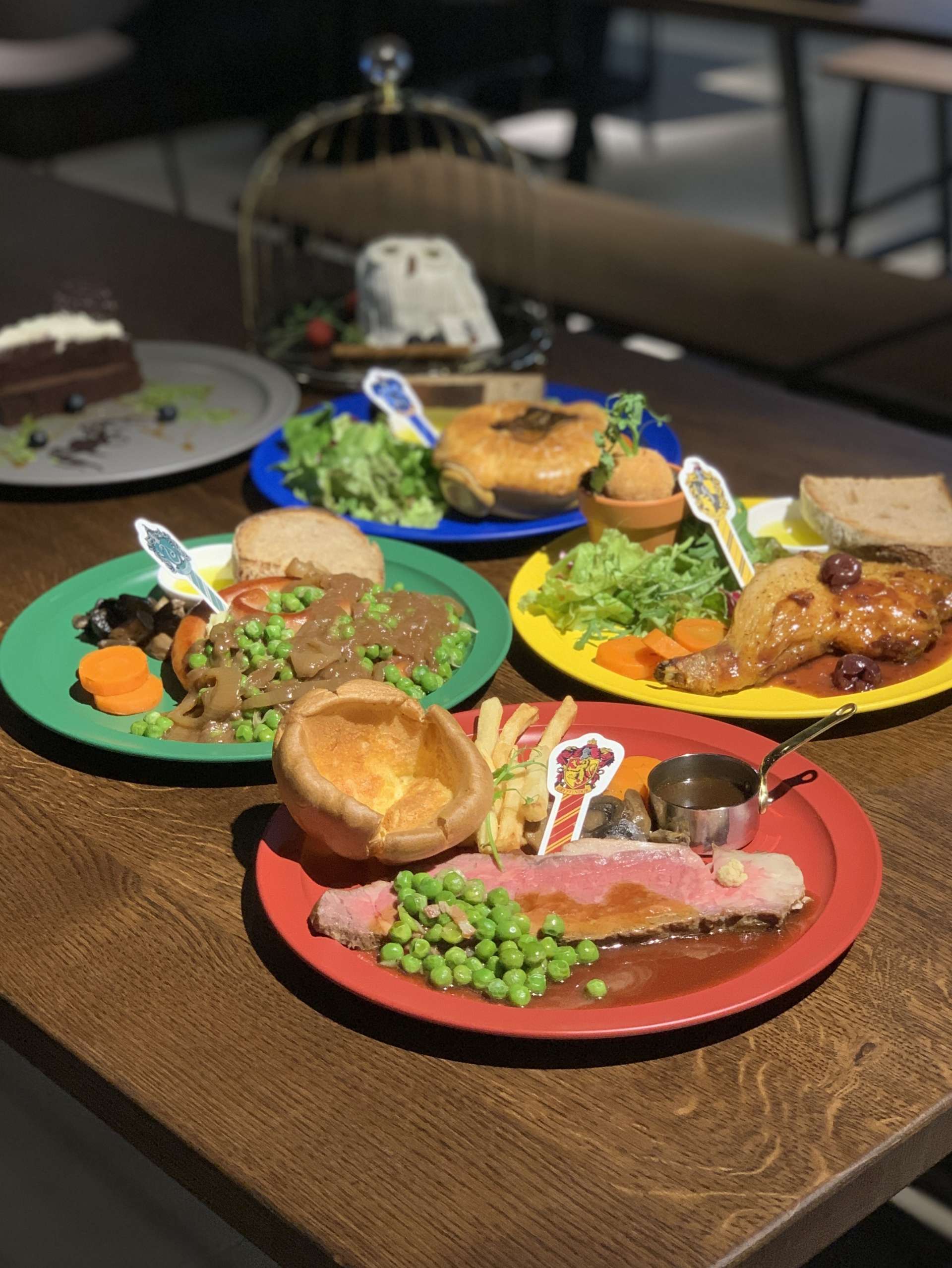 ツアーの途中では、食事のコーナーにも立ち寄ります。バックロット・カフェでは、グリフィンドール、スリザリン、ハッフルパフ、レイブンクローの4つの寮をイメージしたメニューや鳥かごに入ったヘドウィグ型のケーキ、禁じられた森で暮らすアラゴグをイメージしたデザートなど、映画の世界をモチーフにした英国風の食事やスイーツを提供しています。