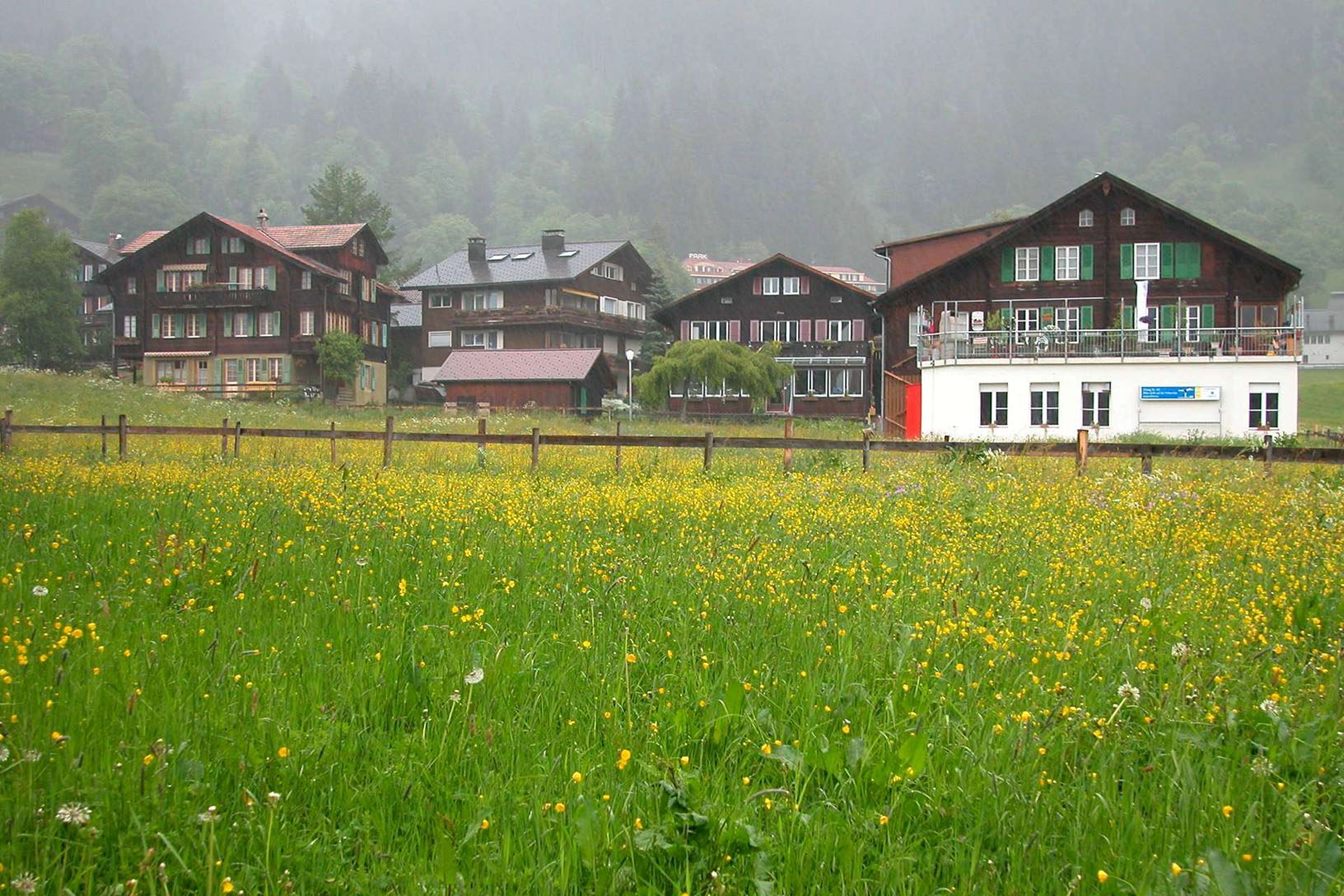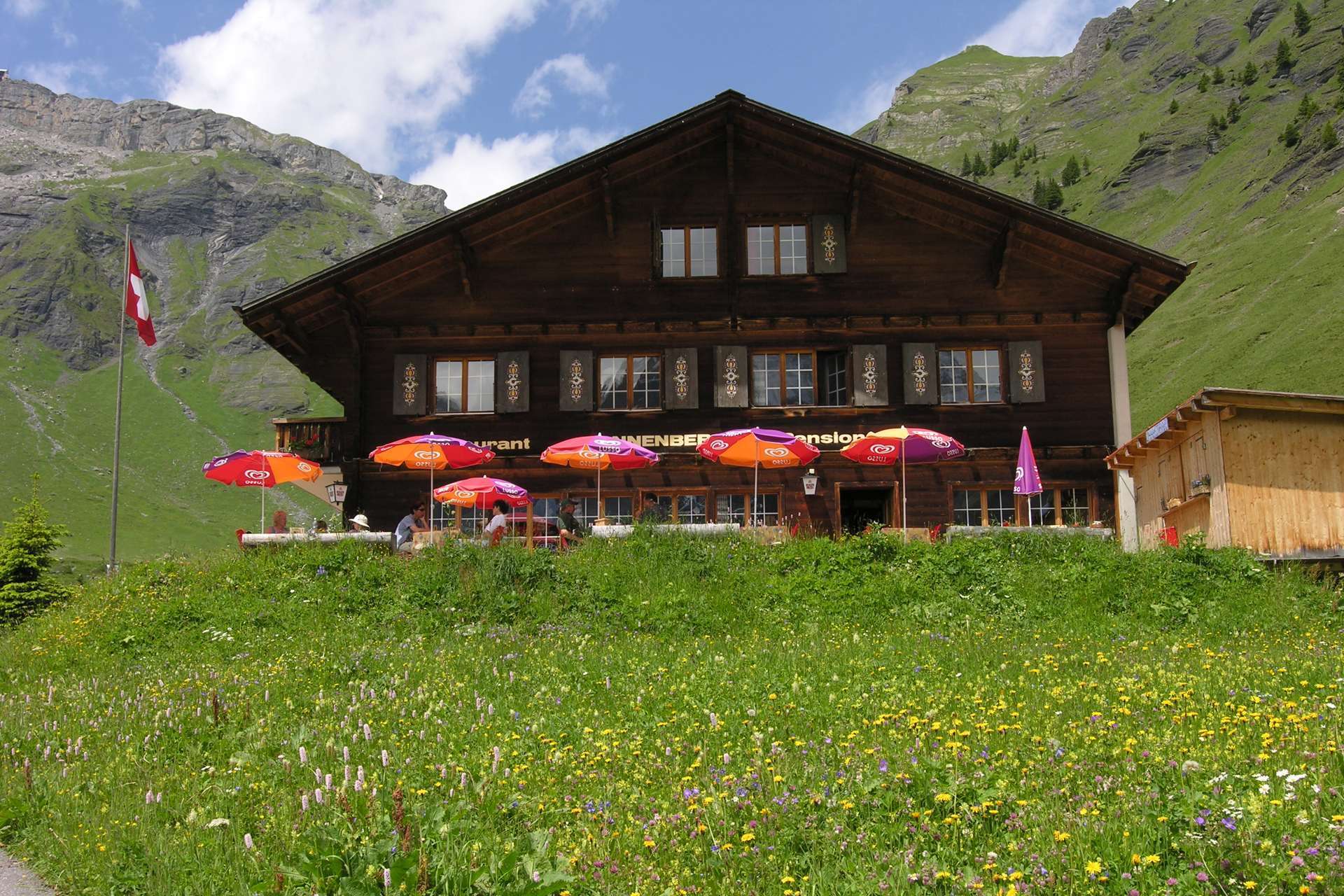 花畑はいたるところにありますが、グリンデルワルトの反対側の谷の上に位置している村ミューレンには、その名も「花の谷(ブルメンタール)」と呼ばれる場所があります。村からケーブルカーで上るアルメントフーベルという展望台からスタートするハイキングコースで、6月は谷全体が花で覆われます。一部に急な下り坂もありますが、お年寄りでも無理なく歩くことができるコースで、食事も提供する山小屋があるので、ハイキングの途中にいい景色を見ながら休憩することもできます。