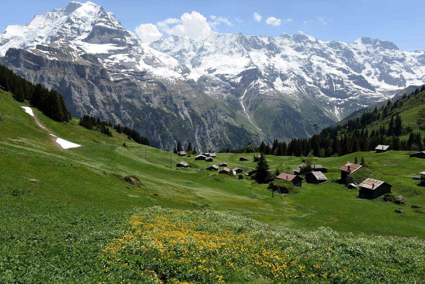 緯度が高く標高も高いスイスの6月は、日本の本州の気候に置き換えると5月上旬から中旬にかけての東北地方に似ています。新緑が目にまぶしく標高の高い場所にはまだ雪が残るくらいの季節です。花畑の景色もすばらしいですが、この新緑の風景も夏や秋には見られないみずみずしさにあふれており、この景色との出合いは初夏のスイス旅行の大きな楽しみです。