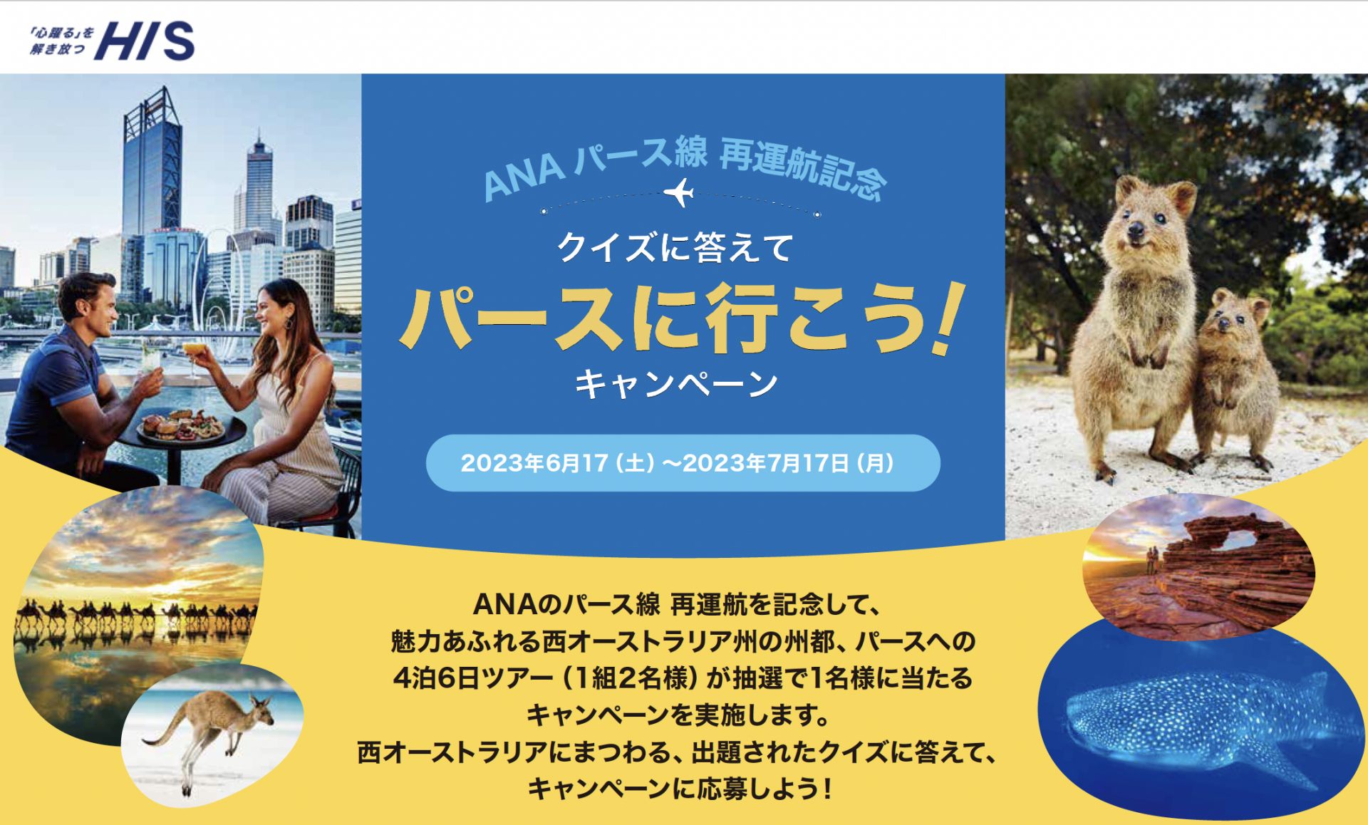 ANAのパース直行便再開を記念し、HISでは2023年7月17日(月)まで「クイズに答えてパースに行こう!」キャンペーンを実施しています。応募した方の中から抽選で1組2名にパース行き4泊6日ツアーが当たります。この機会にぜひ応募しましょう!