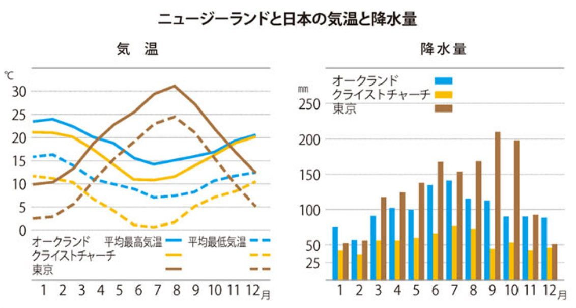 ニュージーランドは南半球に位置し、気候は日本とは逆で、南に行くほど寒くなります。南島では、夏でも朝夕は肌寒く感じることがあります。紫外線は日本の約7倍強いため、日焼け対策が重要です。