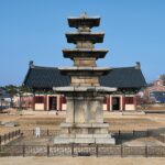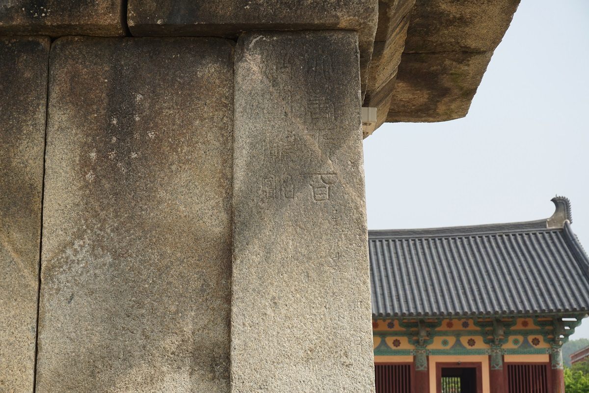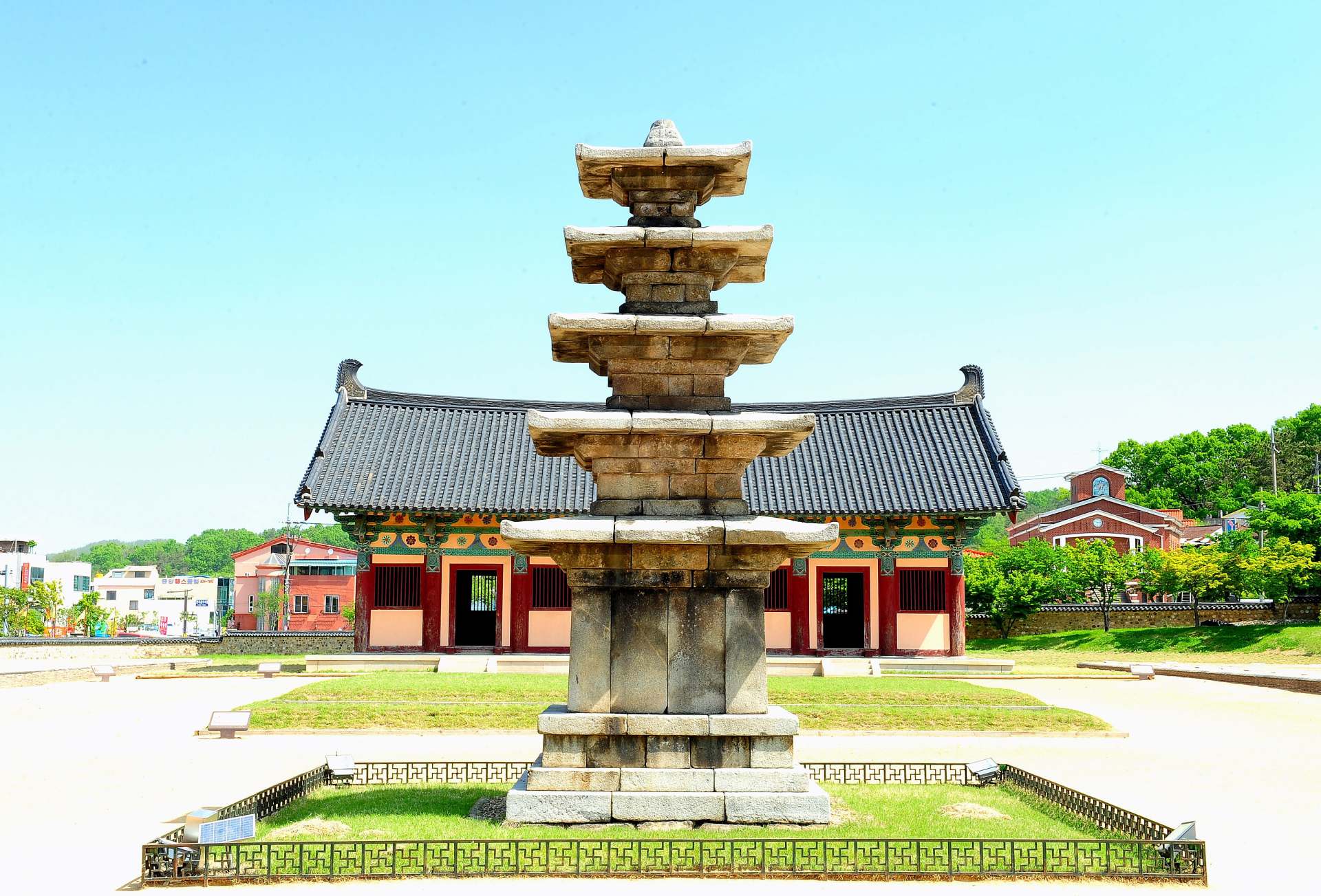 続いて、扶余に来たら見逃せないのがこちらの世界遺産。百済の仏教文化が最も盛んだった聖王の時代に建てられた寺の跡地で、中央に堂々と残された五重石塔は当時のそのままのもの。一部修復はされていますが、近づいてみると細かい傷跡や、文字の彫った跡もしっかりと観られるので長い歴史を直接感じることができます。とくに注目したいのは石塔の右下部分に彫られている「大唐平百済国碑銘」という文字。この石塔は、唐が百済を平定したことを記念する戦勝碑である、ということを示しています。