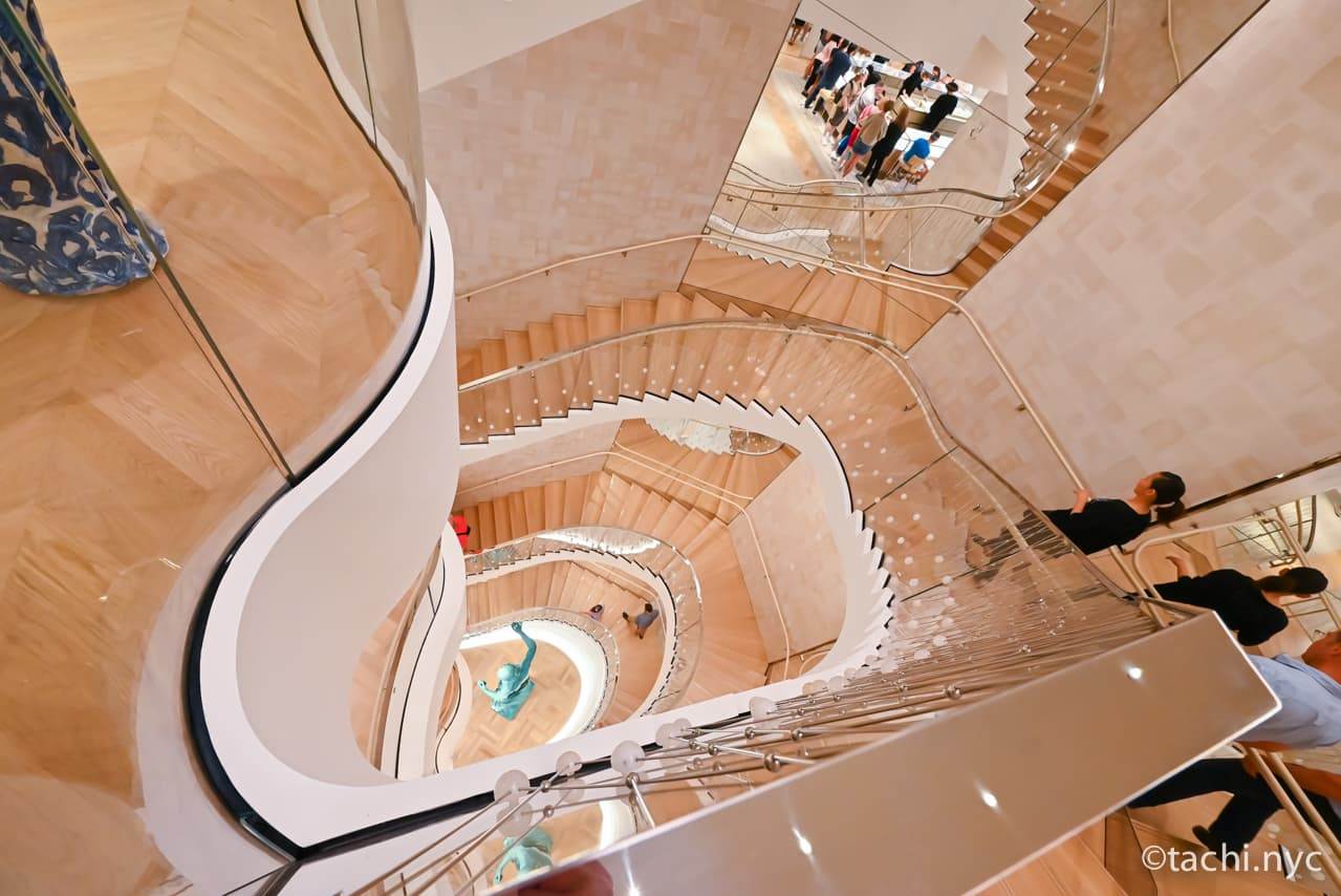 1974年よりティファニーに加わり、40年に渡ってデザインを手掛けたエルサ・ペレッティ(2021年逝去)による、3階から8階へ美しい曲線を描く階段。同氏は、流行となったオープンハートやビーンなど、ティファニーの時代を作り上げたデザイナーでした。