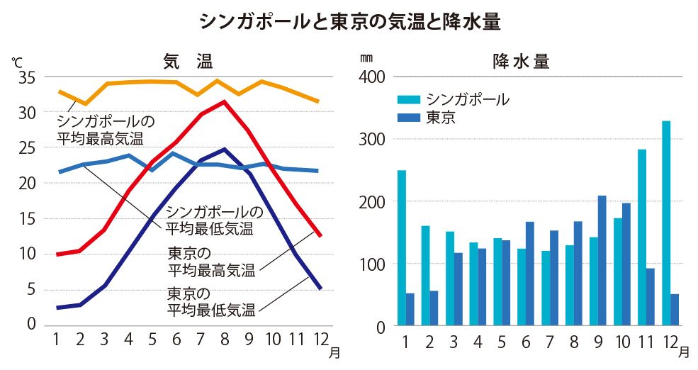 常夏のシンガポールとはいえ、雨季と乾季があり、雨季には涼しい日もあるし、南国特有のスコールは乾季でもときどきあるため、長袖のジャケット、カッパや傘など雨具を持ち歩くことをおすすめする。