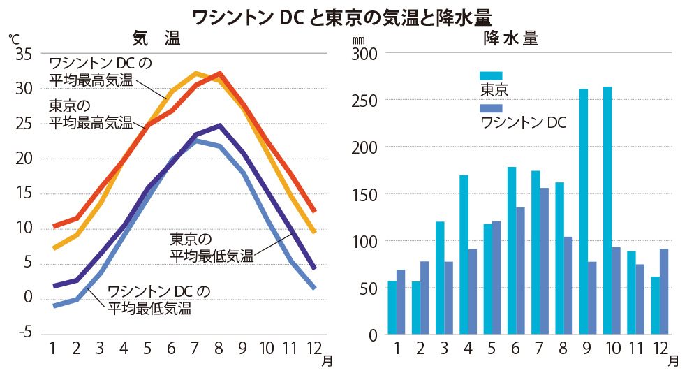 アメリカ東部の気候は、1日のうちに何度も天候が変化するのが特徴。DCの緯度は日本の仙台に近い。仙台あたりの気候を基本に考えるといいが、春と秋が多少短く、夏と冬がそのぶん長い。1日の気温差も大きく、また夏、冬を問わず室内と外の気温差が激しいので、重ね着などで調節ができるようにしたい。また、1年をとおして降雨もある。ただし、1日中降り続くことはあまりない。