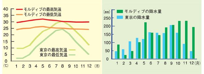 高温多湿の熱帯気候で、年間を通して平均気温が26~33℃。季節はふたつのモンスーンに支配されている。北東からモンスーンが吹く12~4月は、空気もさわやかで穏やかな乾季が続き、南西から吹く5~11月は、雨が多く風の強い雨季となり、波も高くなる。もっとも、水温は年間を通して24~28℃に保たれていて、水中の動植物にとっては楽園そのものだ。