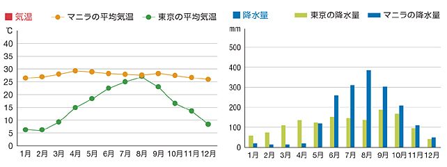 フィリピンは熱帯性気候に属し、年間を通じて暖かい気温が特徴です。年平均気温は26~27℃。雨期は6月から11月で、乾期は12月から5月です。ただし、地域によって気候に大きな差があるため、注意が必要です。