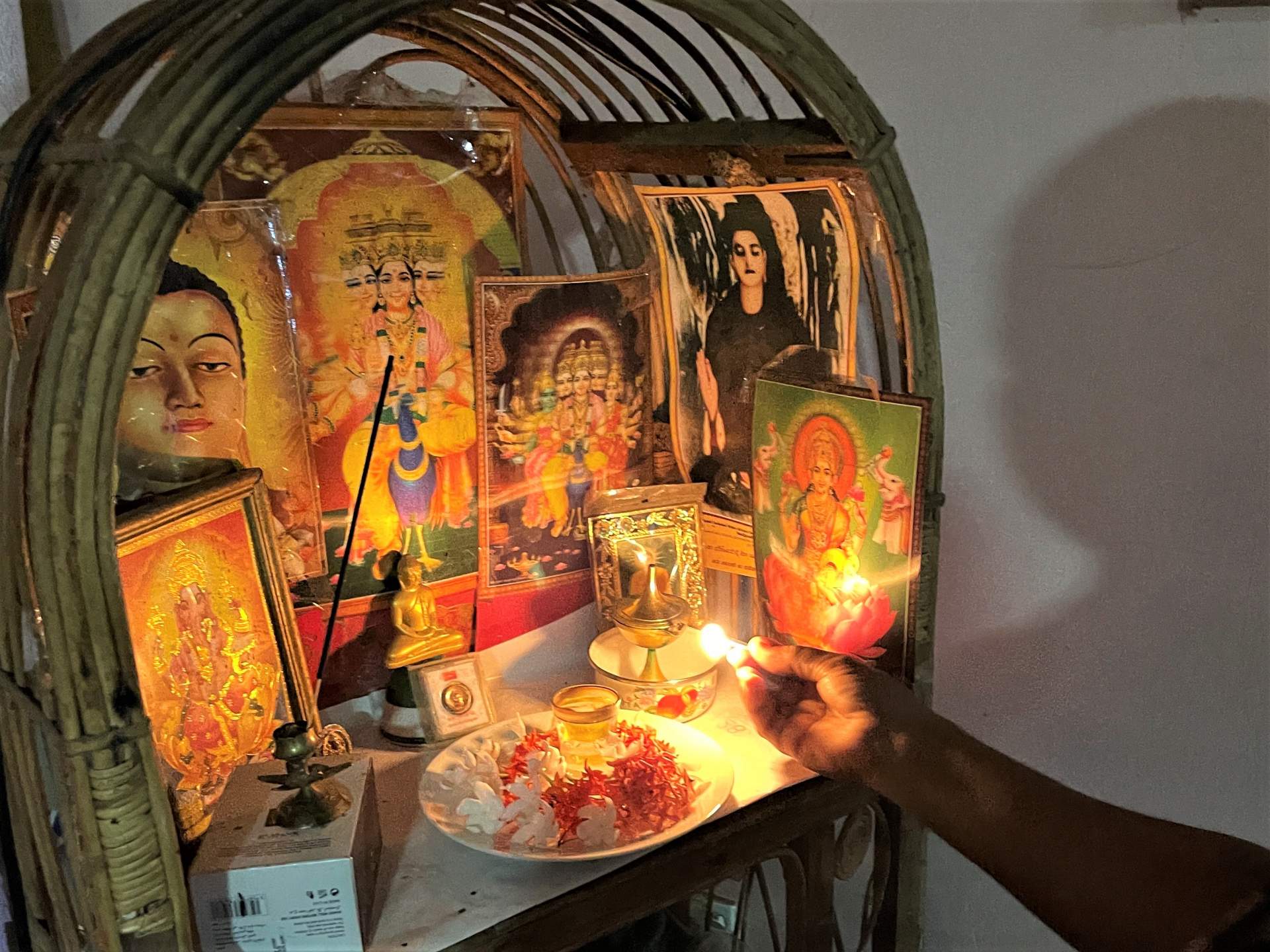 カタラガマ神はヒンドゥー教の神様なので、カラフルな色彩でクジャクに乗っているのが特徴です。商売繁盛や合格祈願、健康祈願、とにかく何でも(たとえそれが悪事であっても)お願いしていいそうです。上の画像はスリランカ人家庭にある祭壇を撮影させてもらったもの。祭壇のお花は毎日庭から新鮮なものを摘みお香とオイルランプをお供えして、神様を大事にしています。