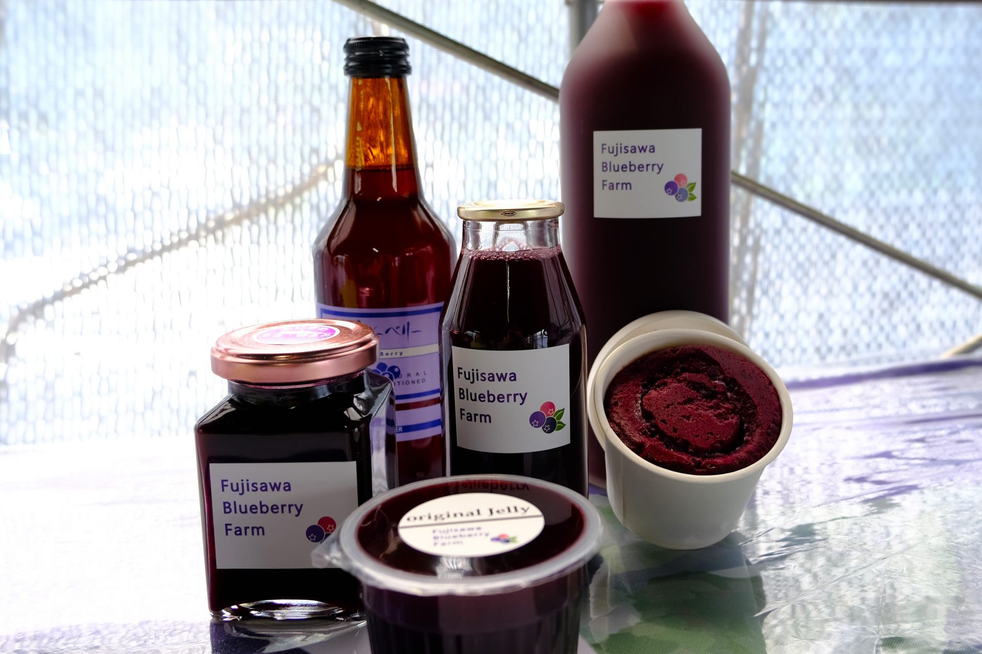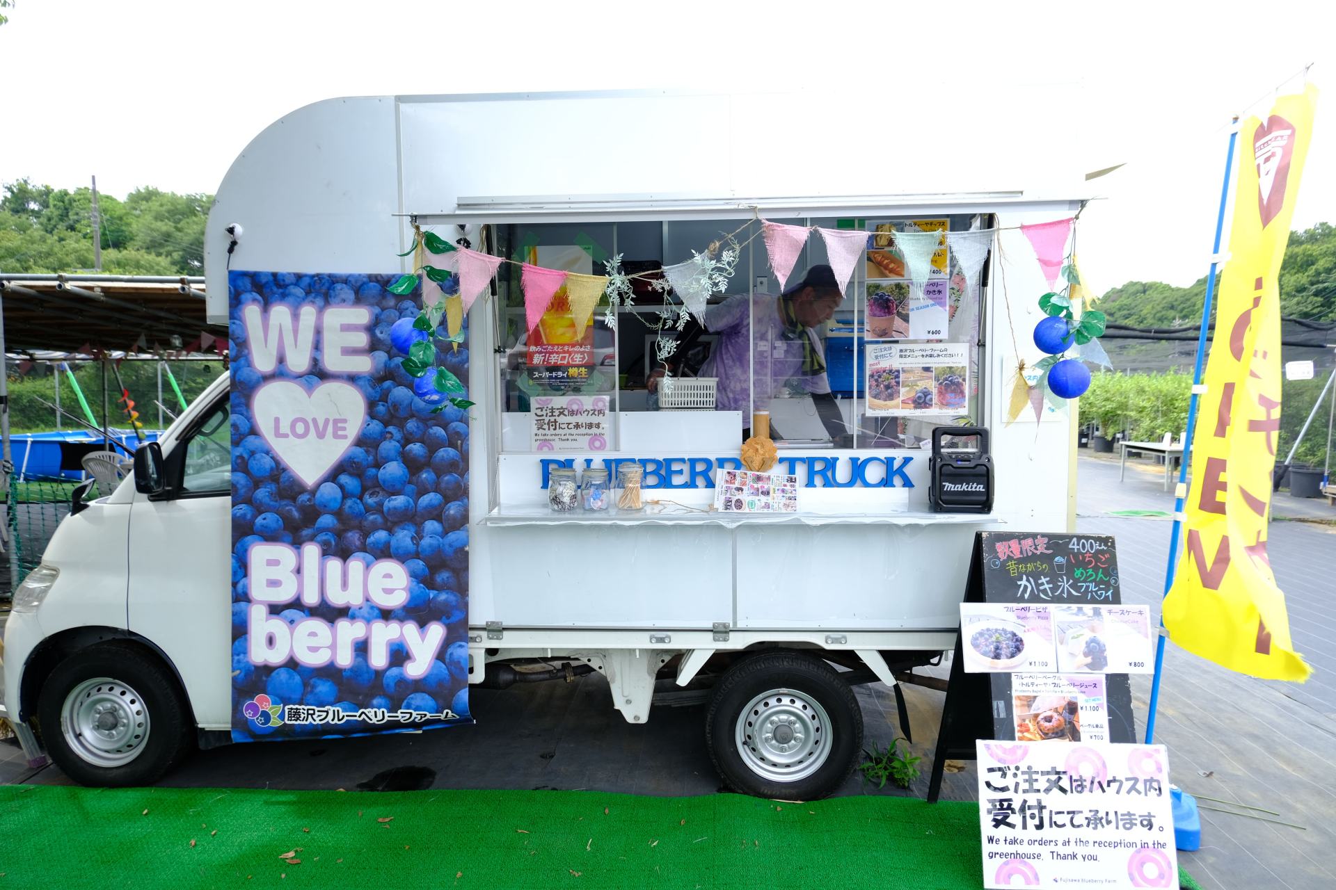 食べ放題以外にも、ブルーベリーにちなんだ充実のカフェメニューにもご注目。キッチンカーではブルーベリーを使ったピザ、ベーグル、チーズケーキといったフードから、スムージーなどのドリンクも販売しています。たっぷりの果実を使用したジャムやジュース、ゼリーなどはおみやげにもぴったり!