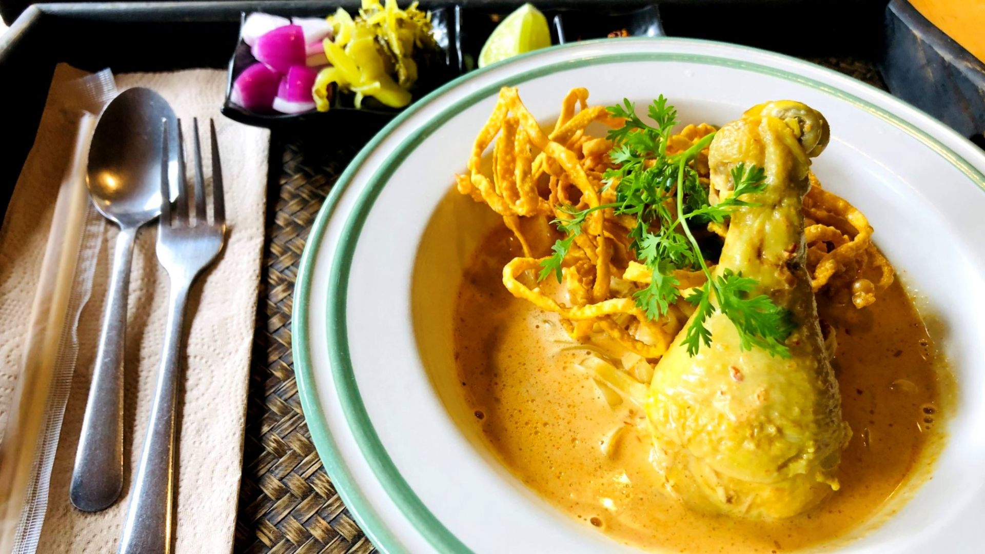 カオソーイはもともとビルマ(ミャンマー)から伝わった料理で、ココナッツミルクベースのカレー味のスープに太めの麺を入れ、その上に揚げ麺をのせたもの。具は鶏肉(ガイ)が一般的ですが、豚肉(ムー)や牛肉(ヌア)、シーフード(タレー)が注文できる店もあります。とろりとしたスープと柔らかな麺、そこに加わるクリスピーな揚げ麺の組み合わせがたまりません。
