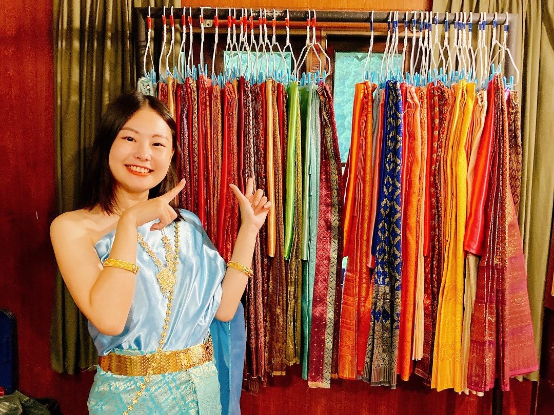 さまざまな色の衣装が取り揃えられているので、自分の好きな配色のものを選びましょう。選んだらスタッフの方が着付けを行ってくれます。靴は借りることができないので、こだわりたい方はタイ衣装に似合う靴を持っていくのをおすすめします。