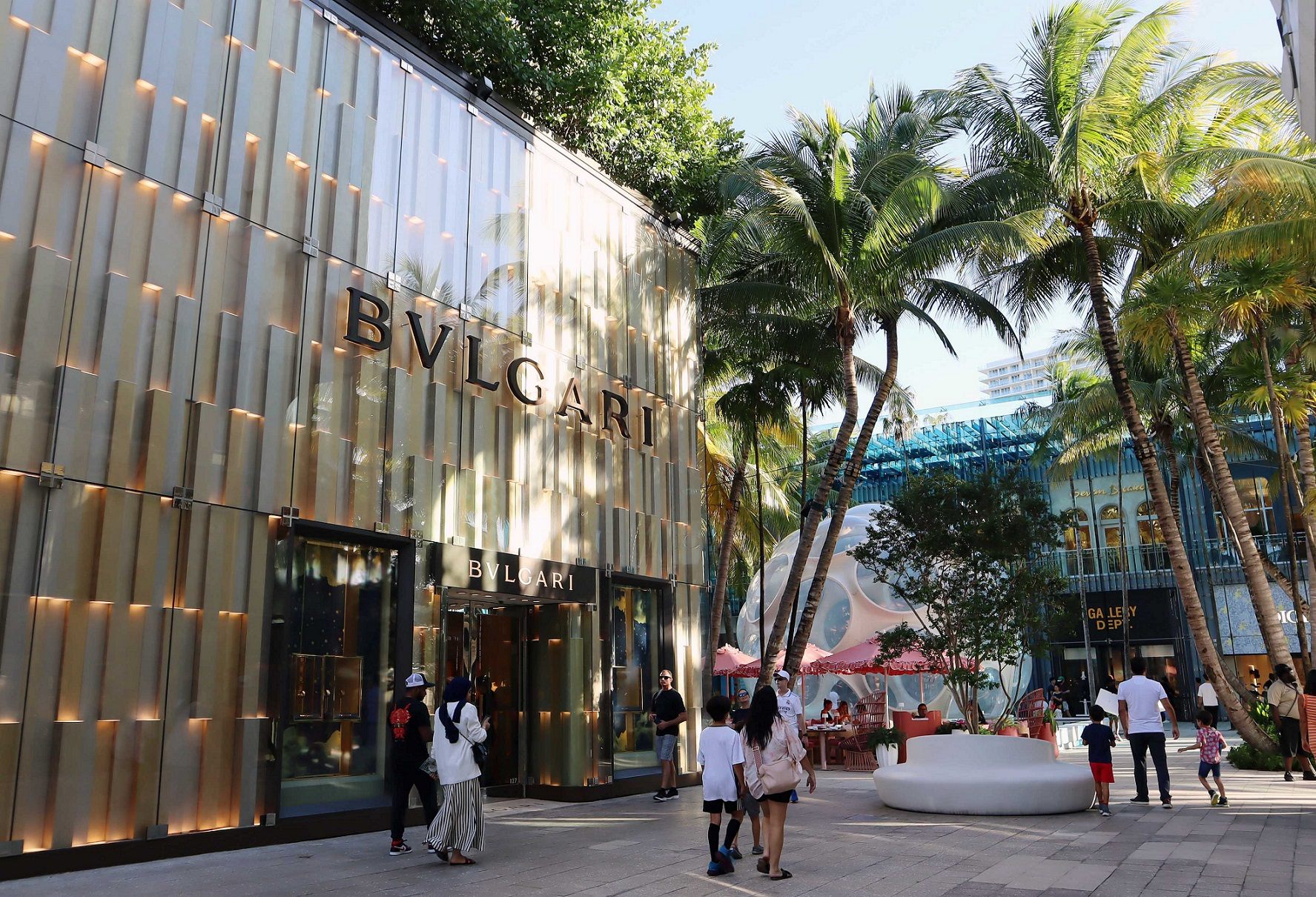 「ブランド街」と聞くと、ニューヨークの五番街や東京の銀座通りを連想するかもしれません。マイアミのデザイン地区は1本の大通りではなく、約170の建物が5×3ブロックのエリアにまとまっています。一般車両乗り入れ禁止の道もあり、公園を歩く気分でショッピングが楽しめます。道が1本違うとガラッと雰囲気が変わるのもおもしろく、一種の迷宮のよう。高級ブランドが多いものの、リッチな人だけでなく普通のマイアミっ子も大勢訪れ、マイアミの多様性を見ることもできます。豊かな緑のなか、ジェラートショップがあったり、ブランコがあったり、いつものアメリカのショッピングゾーンとは違った、マイアミらしい開放的な空気を味わえるでしょう。