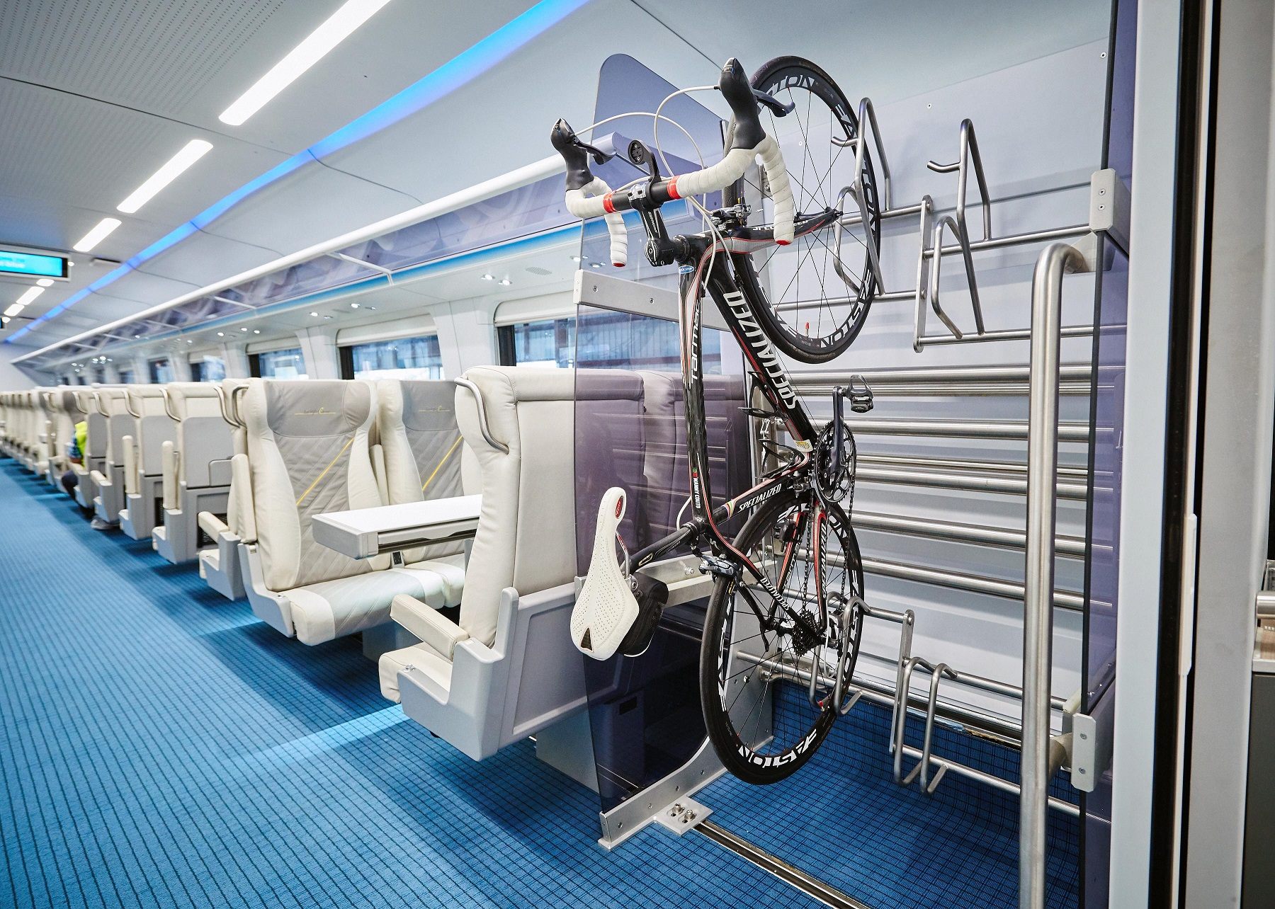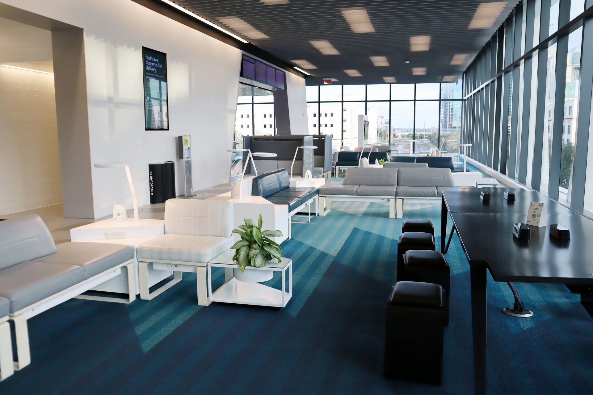 日本の新幹線との大きな違いのひとつが、駅の待合室です。空港のビジネスクラス・ラウンジのように、ゆったりとしたソファがいくつも置かれ、横にはバーカウンターもあります。無料のWi-Fiも開通して、コンセントの数も豊富。ブライトライングッズも販売する売店は、無人でキャッシュレス。デザインもスタイリッシュで、いるだけで高級感を味わうことができます。