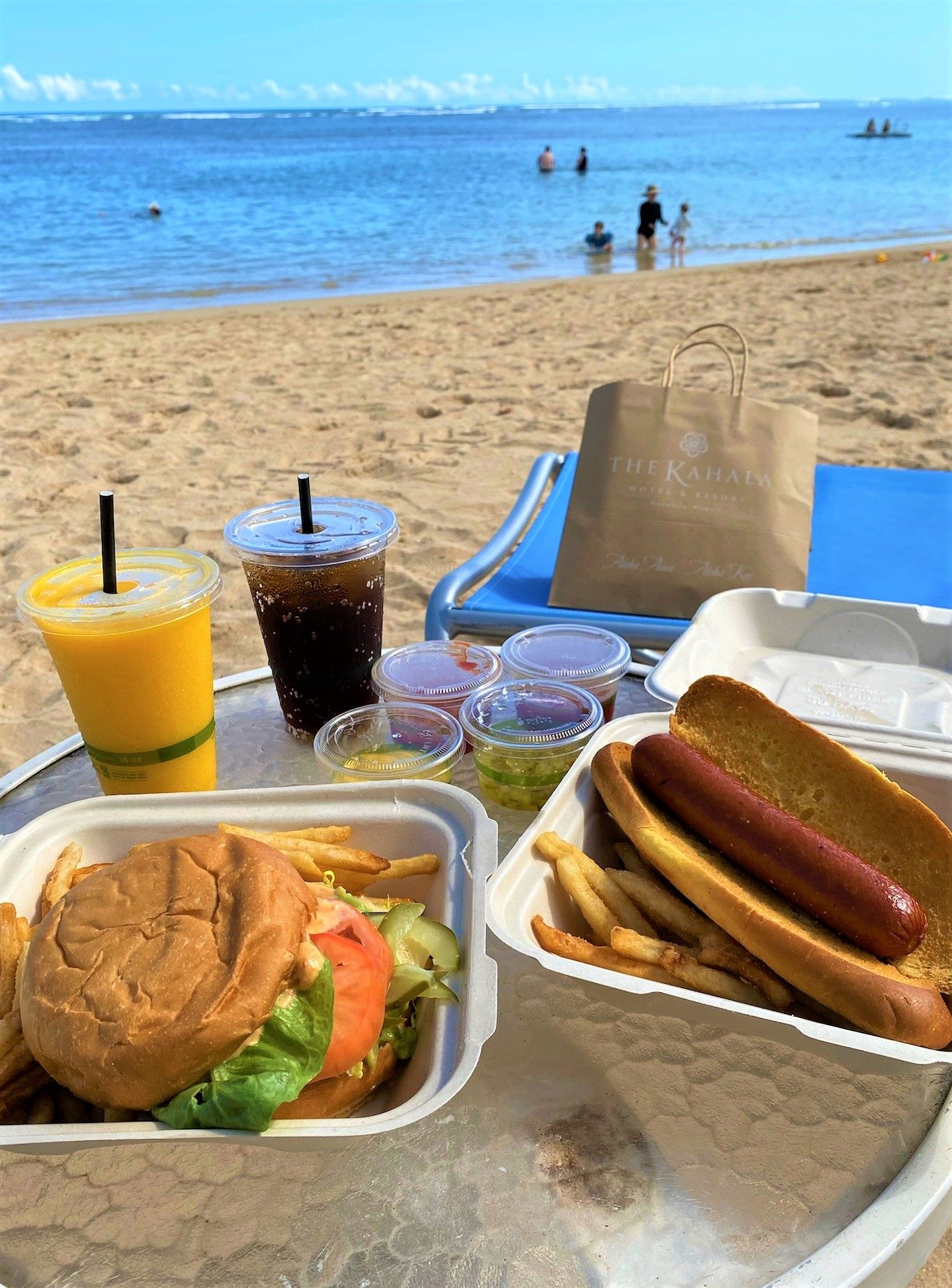 とある日のランチは、プールサイドにあるレストラン「シーサイドグリル」でカハラバーガー(26ドル) と オールビーフホットドック(16ドル)テイクアウトして、ホテルのプライベートビーチで最高に気持ちいい浜辺のピクニックを。