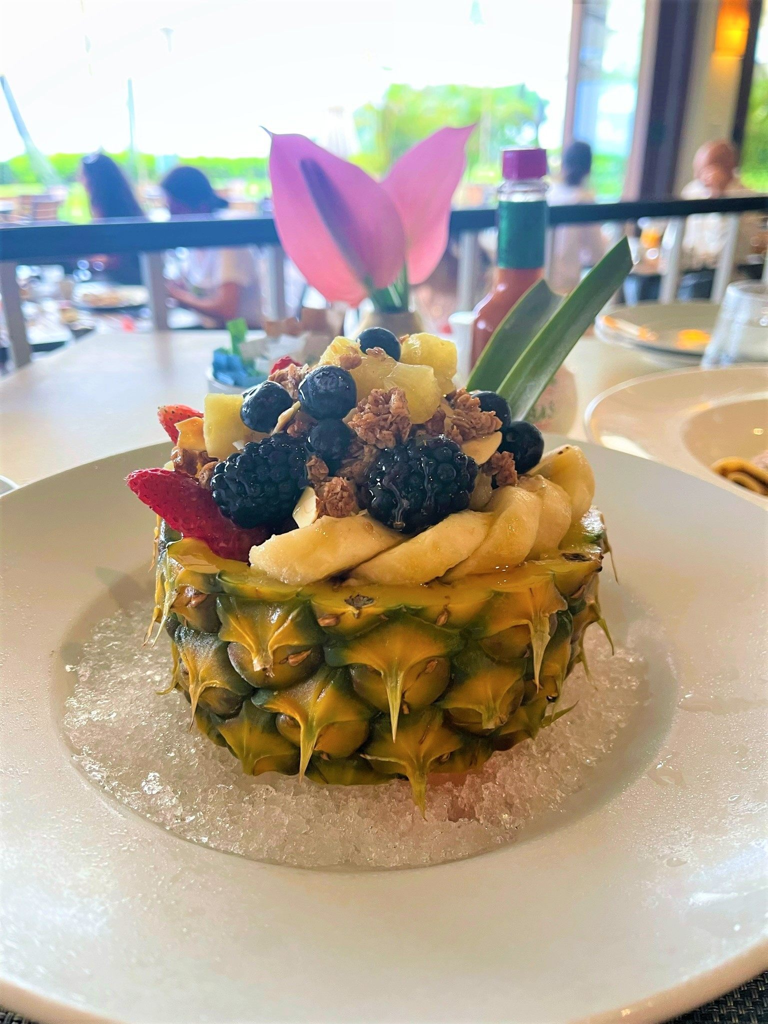 滞在2日目の朝食では、アラカルトをチョイス。お気に入りは「ハワイアンスタイルアサイーボウル(16ドル)」。くり抜いたパイナップルの中に、ひんやりしたシャーベットタイプのアサイー、手作りのグラノーラ、フルーツがぎっしり入って、とってもフォトジェニックなのです。写真を撮りたい! でも、溶けないうちに食べたい! そんな気持ちがせめぎ合うかわいい一皿。