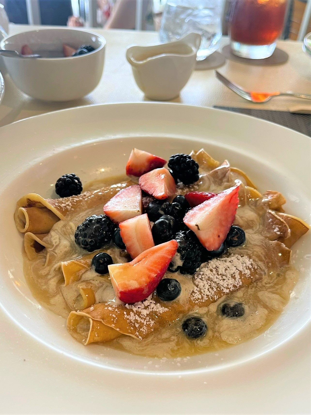 それから、カハラ名物の「シンパンケーキ(18ドル)」も欠かせません。くるくるとまかれた薄焼きパンケーキに、追加でベリー類をトッピングして、メイプルバターのソースを上からとろ〜り。焼きたてはひと味もふた味も違うんです。