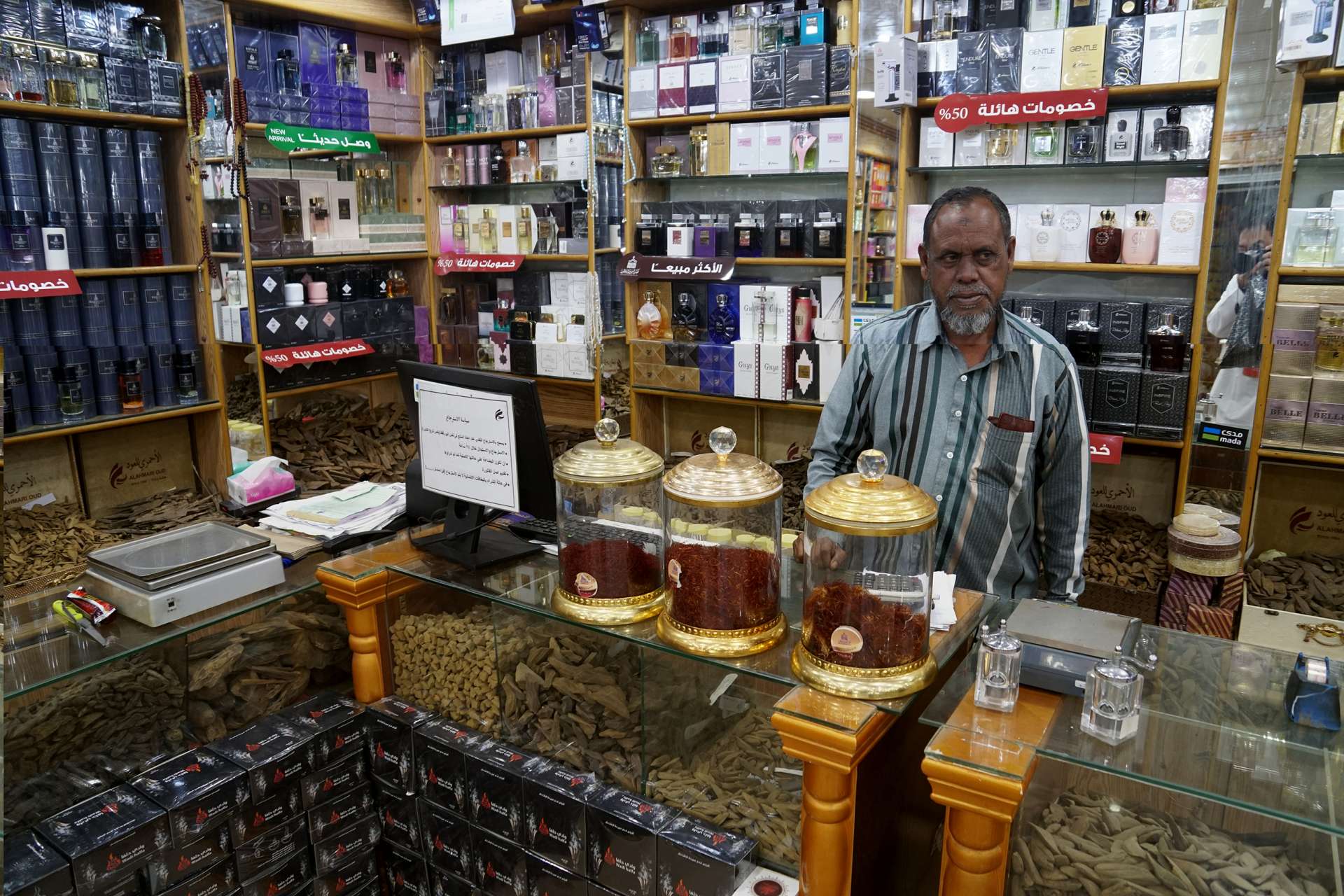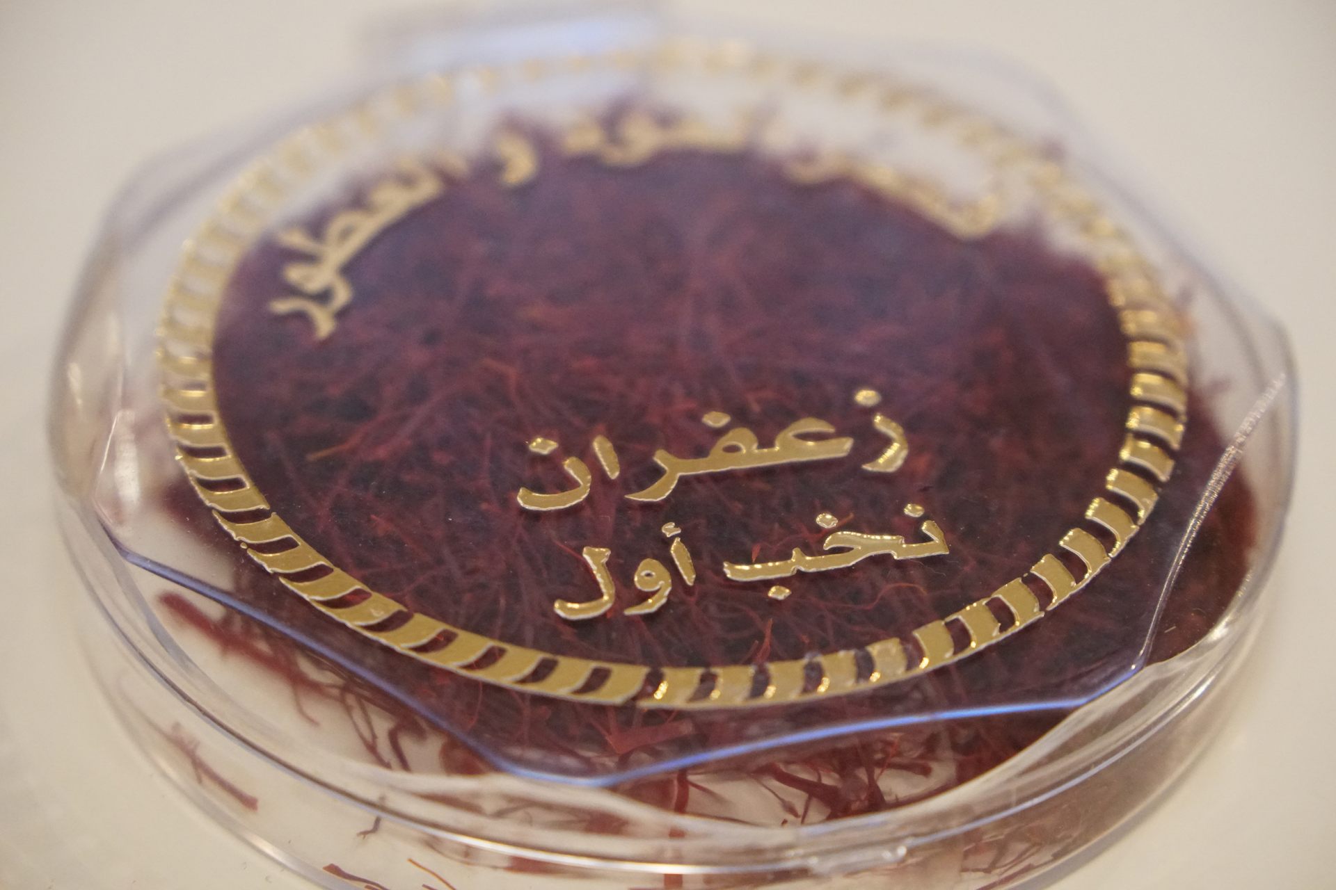 スークではハチミツ、コーヒー、香水(香木)、服やアクセサリーなど色々な店がありますが、香水屋の一角になぜかサフランコーナーが…。