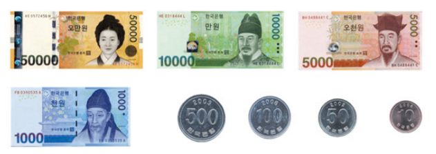紙幣は1000ウォン、5000ウォン、1万ウォン、5万ウォン。硬貨は1ウォン、5ウォン、10ウォン、50ウォン、100ウォン、500ウォンがありますが、1ウォンと5ウォンは事実上流通していません。