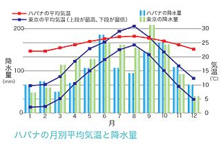 キューバの気候は、亜熱帯性海洋気候で、年間の平均気温は約25.5℃です。