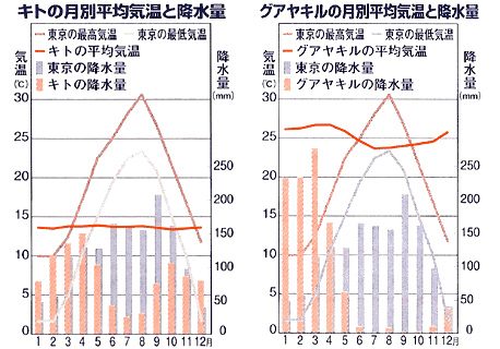 首都キトは標高が高く、年間平均気温は14℃で「永遠の春」と呼ばれる快適な気候です。