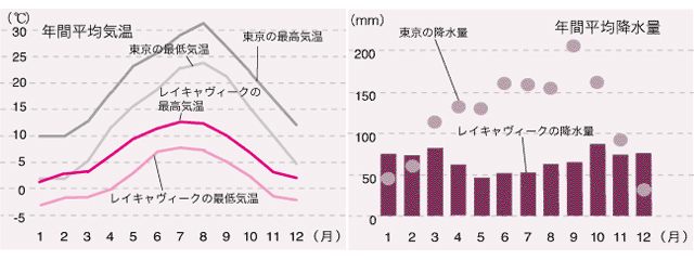 国土のほとんどが北極圏(北緯66度33分)のすぐ南にあたるが、沿岸を流れるメキシコ暖流と、活発な火山活動による地熱の影響で気候は冬でもそれほど気温は下がらない。夏はアイスランド北部では、白夜の状態となり、逆に冬には日照時間が短くなる。