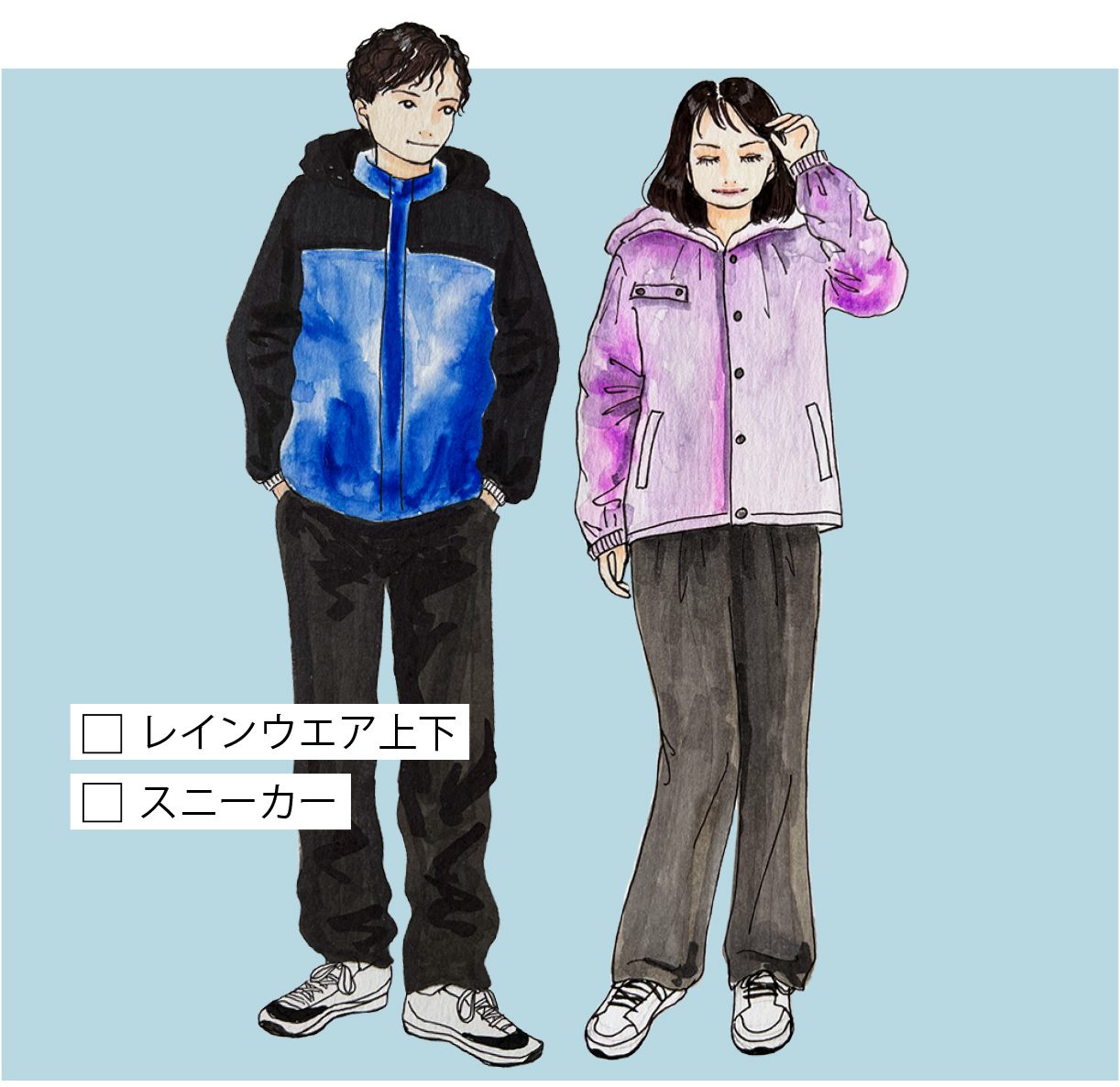 突然の雨に備えてアウターはフード付きを。