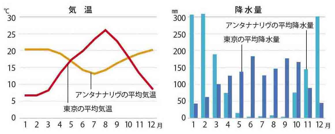 大きく6つの地域に分けられる。中央部(アンタナナリヴなど)は、高地のため年間を通して涼しく過ごしやすい。雨が少なく、雨季であっても1日中降り続くことはあまりない。東部(セント・マリー島など)は、亜赤道帯気候で高温多湿。東海岸には正面から強い貿易風が吹くため1年中雨が降りやすく、1~3月は台風(サイクロン)の影響を受けやすい。西部(ムルンダヴァなど)は典型的な熱帯性気候で、高温で乾燥している。夏は猛暑に。北西部(ヌシ・ベなど)は東海岸とほぼ同じだが、雨量はやや少なめ。北部(ディエゴ・スアレスなど)は高温で乾燥している。南西部(ベレンティーなど)は乾燥地帯で、砂漠化が進んでいる。