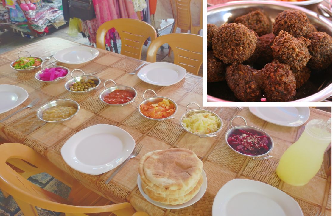 ランチはオーソドックスなイスラエル料理店で。テーブルにはあらかじめ彩り鮮やかな野菜や副菜類が並べられている。サイドディッシュが多いのがイスラエル・スタイルだ。席に着くとまずは冷えた自家製レモネードが暑い日差しにさらされたカラダを潤してくれる。グラスを傾けているとサラット・イスラリー(トマトやキュウリを刻んだサラダ)やファラフェル、シュワルマ、カバーブの皿が次々と運ばれてきてテーブルの上を埋め尽くしていく。皿から取って食べてもよし、ピタに挟み込むのもよし、すくい取って食べるもよし、イスラエル料理に気取りはない。香辛料も塩分も控えめ、おだやかで素材の味を生かした味なので旅行者でも馴染みやすい味だ。