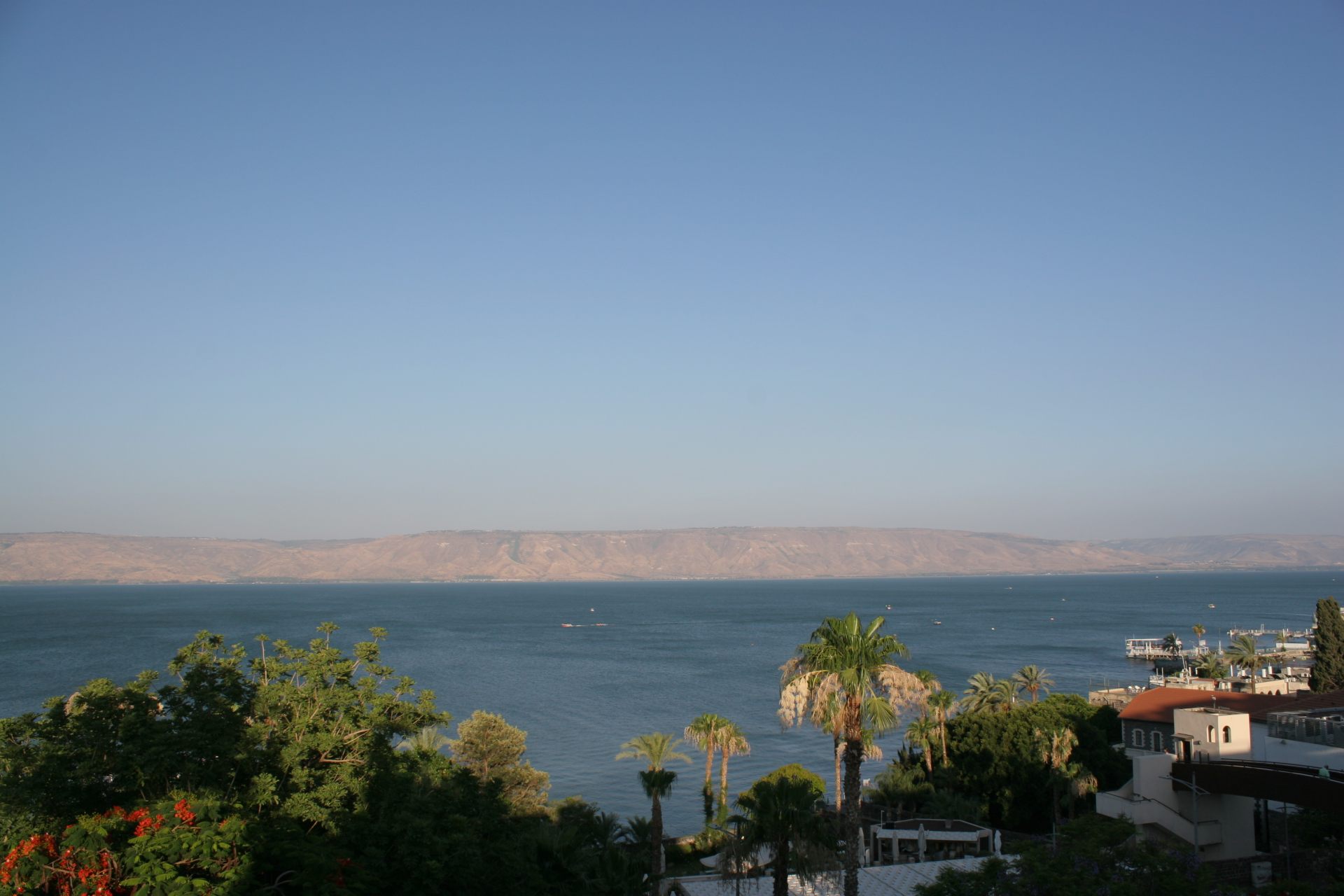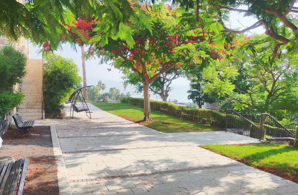 宿泊した湖畔のホテルは、1885年にスコットランド人のトレンス医師が建てた歴史ある病院。トレンスは宗教の違いにかかわらず診療し、人々から慕われていたという。ホテルのテラスに出てみた。ガリラヤ湖さえ霞んでしまう日差しのなか、鳳凰樹が赤く燃えるように咲き誇っていた。