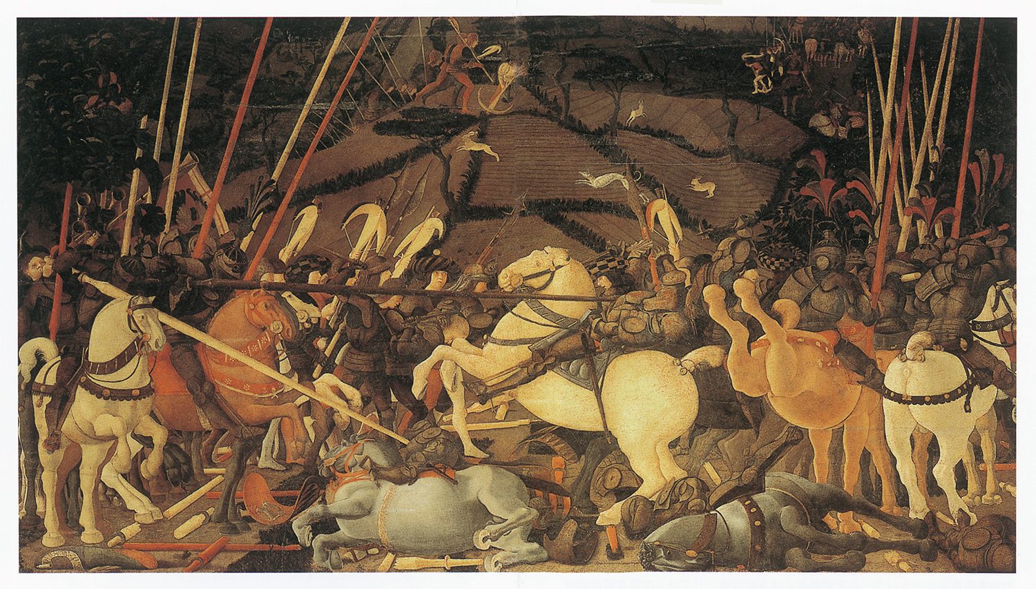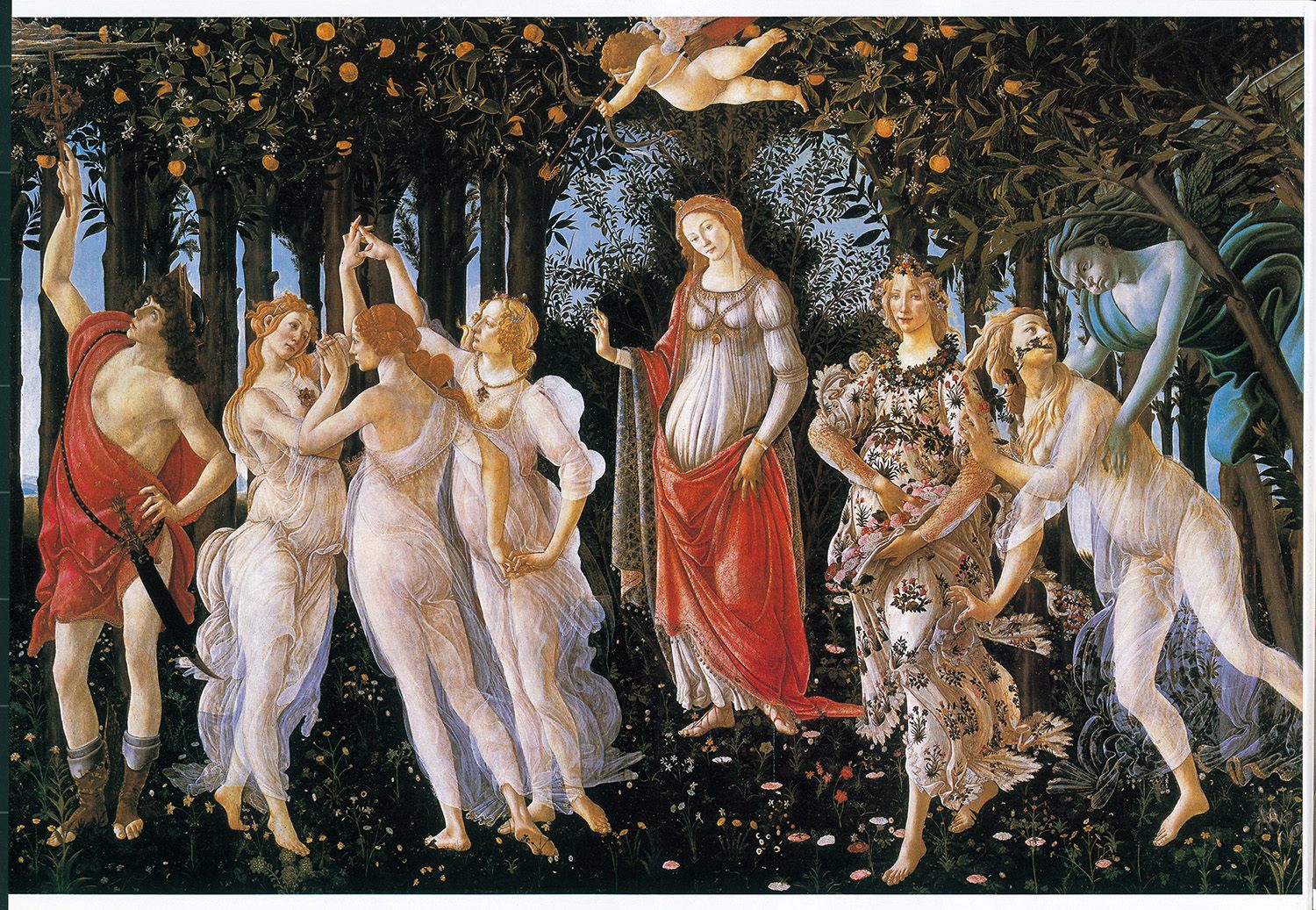 図象学的にはいろいろと解釈されるが、薄いベールをまといしなやかに踊る女神たち、さまざまな野の花で飾り立てた女性像、オレンジが実る森の風景や足元の植物など、「春の賛歌」にあふれ、音楽が聞こえてきそうな画面展開だ。描かれた200種もの植物は今もカステッロの別荘付近で見られる物も多いという。