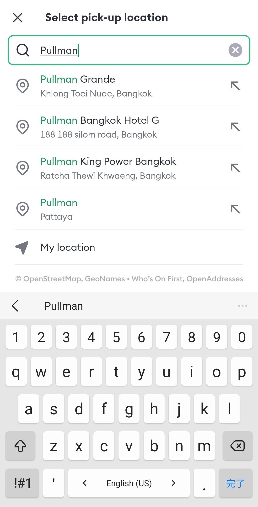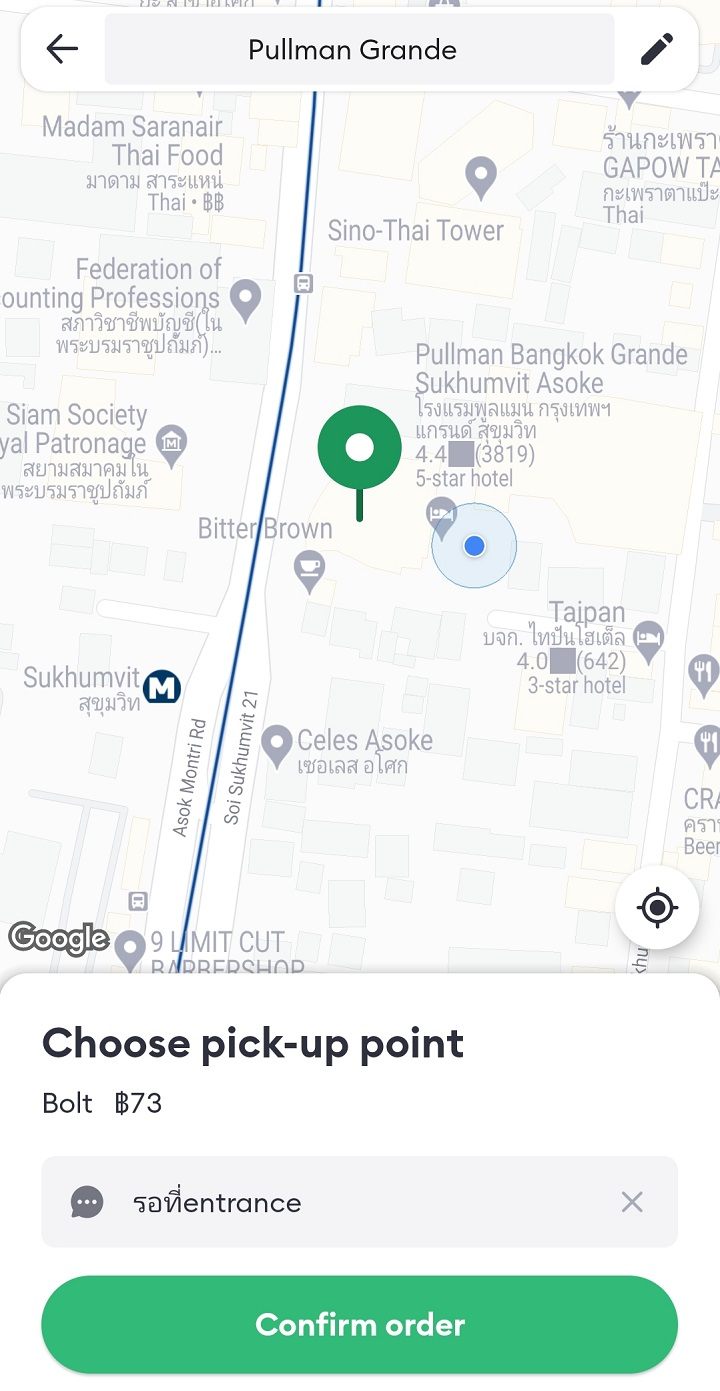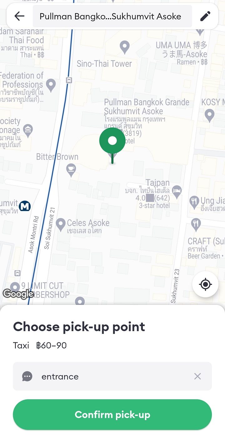 今回の例では、BTSアソーク駅(MRTスクムウィット駅)から徒歩圏内のホテル「Pullman Bangkok Grande Sukhumvit」から乗車します。Pullmanと入力すると、いくつか候補が出てきます。