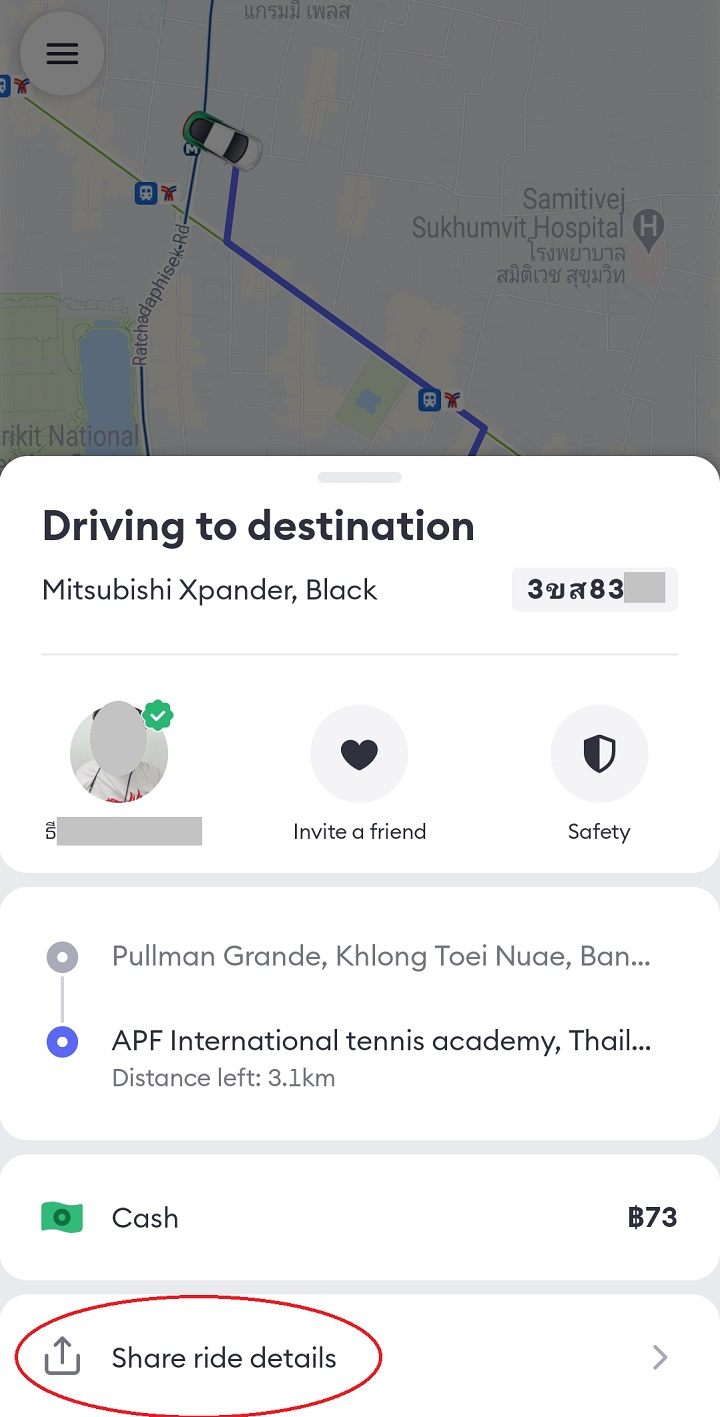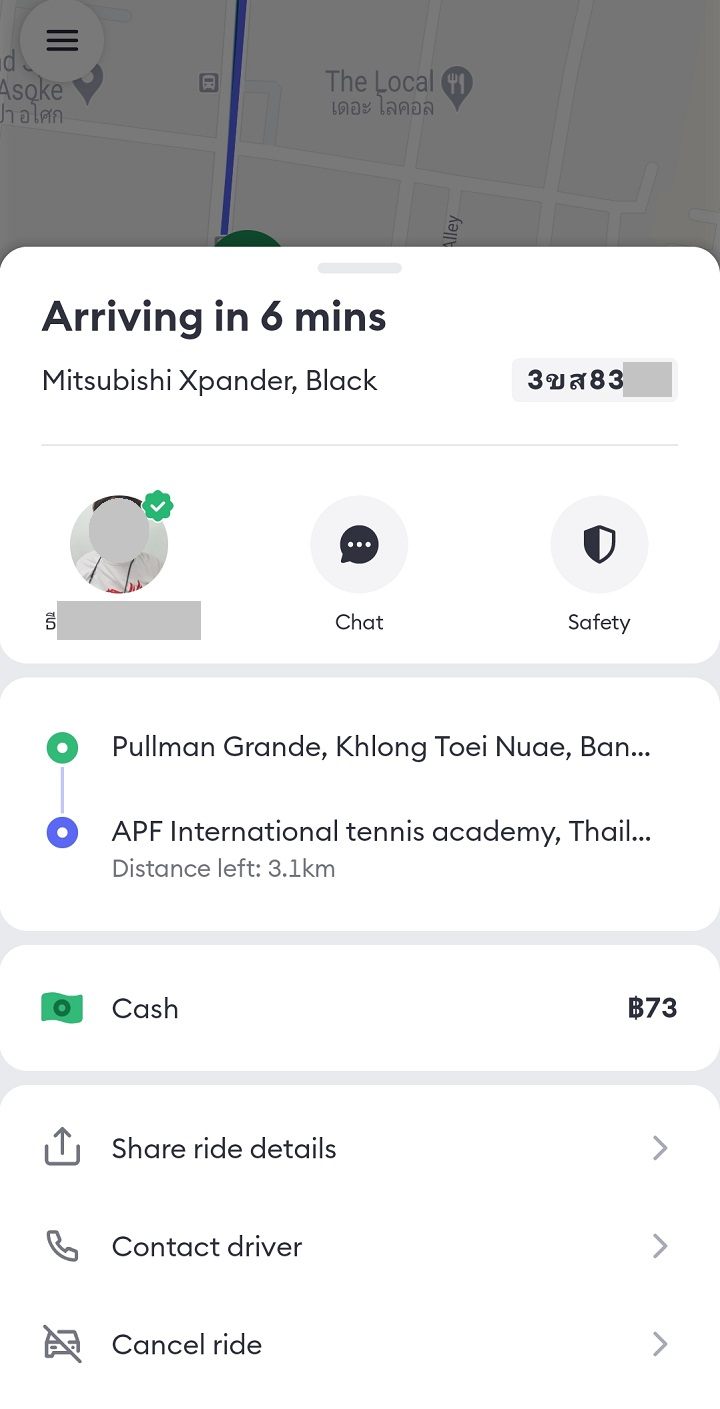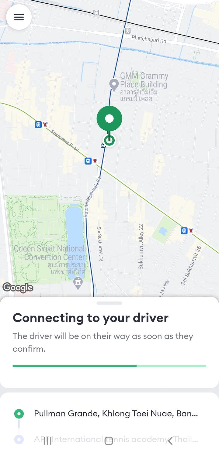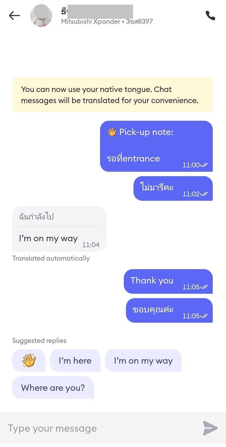 前述したとおり、チャットには自動翻訳機能(英語)があります。運転手がタイ語で記載する文章は英語でも見られます。今回のやりとり(上の画像)では、タイ語で「エントランスで待っていますが、来ないですか?」とメッセージを送ってしまいましたが、マッチングして問題なさそうであれば、メッセージで「Thank you」と送り、待っていることをアピールするとよいと思います。