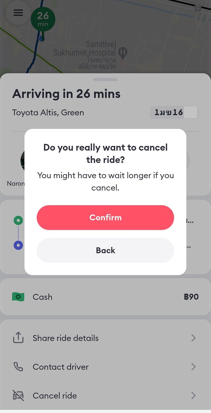 今回マッチングした運転手の中には、26分かけてピックアップしに来てくれるという人もいましたが、あまりにも時間がかかりすぎると感じ、こちらからキャンセルしました。キャンセルする際には、アプリ上で「キャンセルすると、もっと長く待つ恐れがあります」と表示されましたが、その後すぐにより近くにいた運転手とマッチングできました。土地勘がないとその判断は難しいかもしれませんが、観光スポットや都心部であれば、Boltの利用者も多いと思いますので、運よく乗れることもあります。