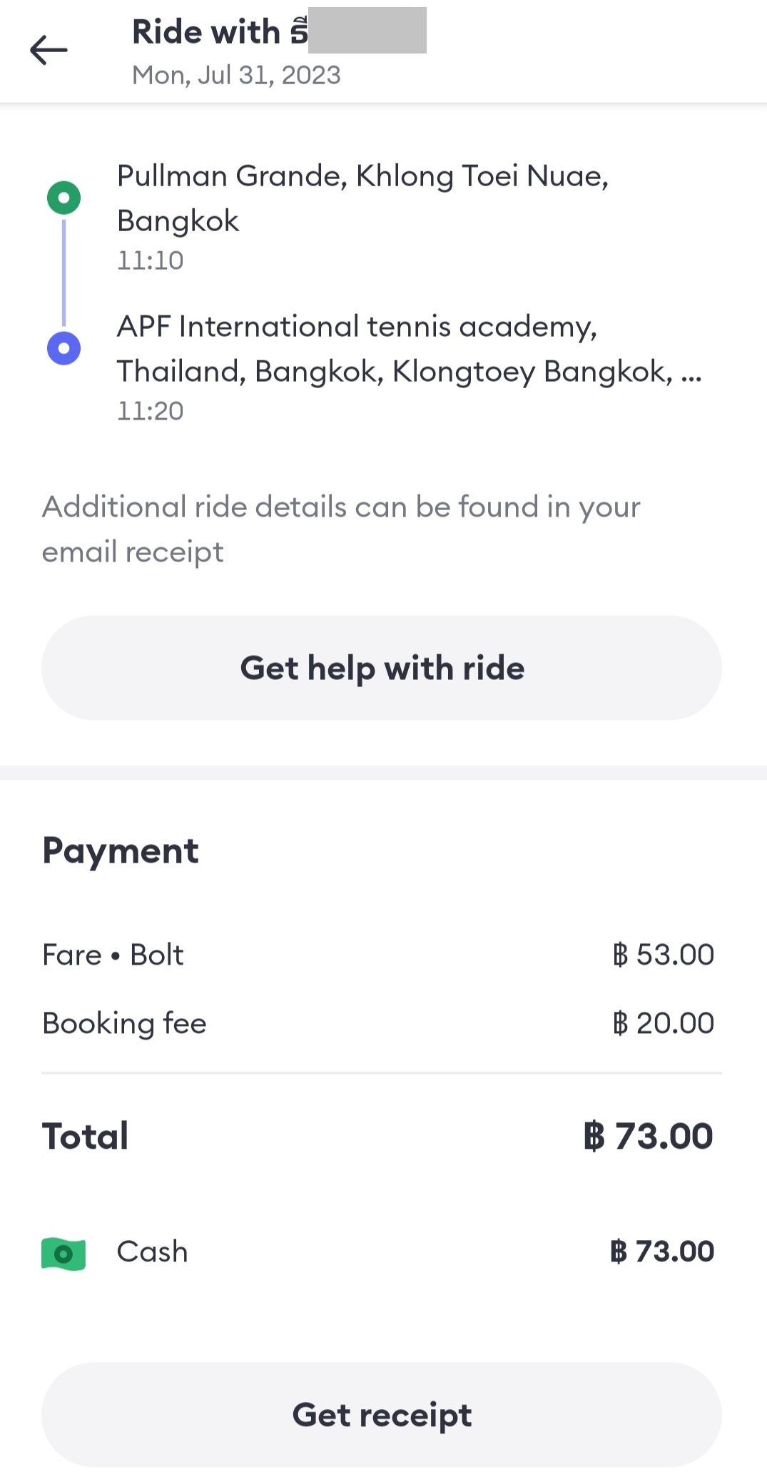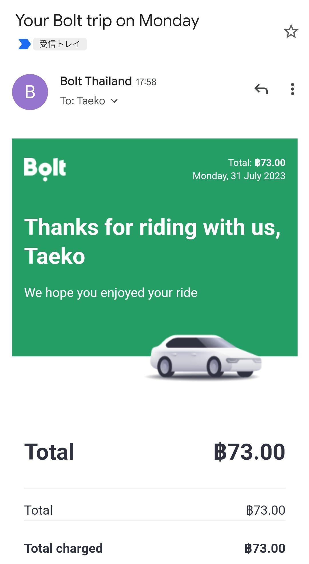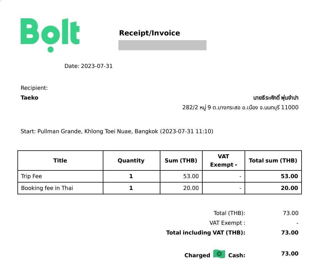 一般的に、タイで流しのタクシーを利用する場合、領収書を発行できるケースはごくわずかです。Boltの領収書にはチップを渡してもその金額が反映されず、宛名が自分の下の名前になってしまうと思いますが、仕事で使う方には便利だと思います。