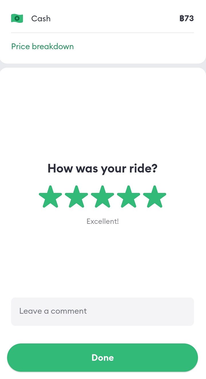 特に問題がなければ、5つ星評価でよいと思います。運転手の対応がよければ、チップを加えた金額を渡すとよいでしょう。今回、車内が綺麗で嬉しかったので、コメント欄に「รถสวยมากค่ะ (車が綺麗)」と書きました。配車サービスアプリBoltでは、乗客もレビューされるようで、利用後には筆者にも星が付いているようでした。