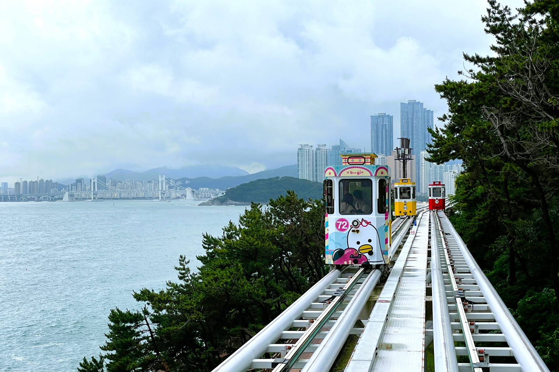 訪れた6月末は梅雨入りしたばかりのタイミングで、雨に降られることもあり少し残念。でも、そんな旅の風情も一興。曇り空のなか乗車したのは、こちらも2020年にオープンした海雲台ブルーラインパークを往復するふたつの乗り物。旧鉄道施設を再開発した最長約4.8kmを、海沿いの景色を眺めながら移動します。