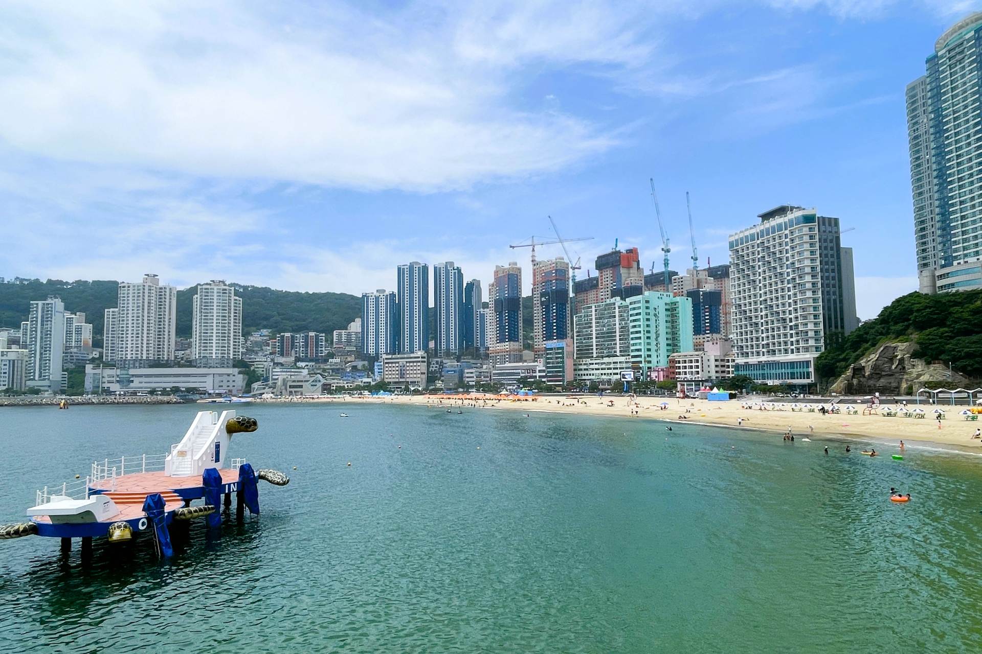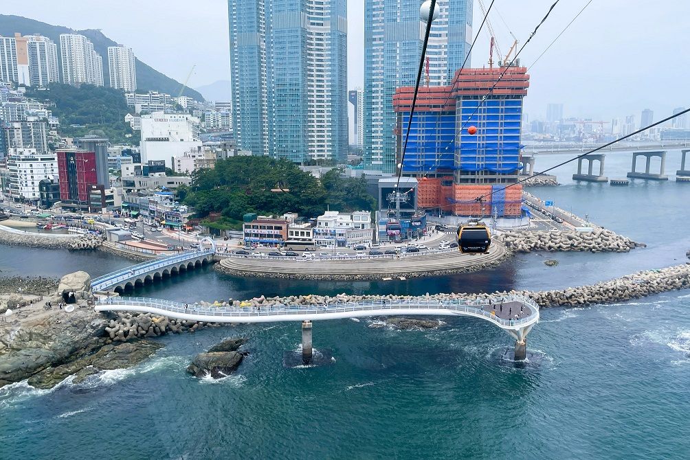 1917年にビーチリゾートとして開発され、ホテルや海鮮の専門店が開業するなど、一大観光地へと発展。その後、釜山国際映画祭の開催や高層ビルの林立などで海雲台に押され気味ではあったものの、2015年の松島スカイウォークのオープンを機に巻き返しがスタート。2017年には松島海上ケーブルカーがベイステーションからスカイパークまでの約1.62kmを繋ぎ、海上最大約86mの高さでの空中散歩が満喫できるとあって、行列ができるほどのにぎわいでした。