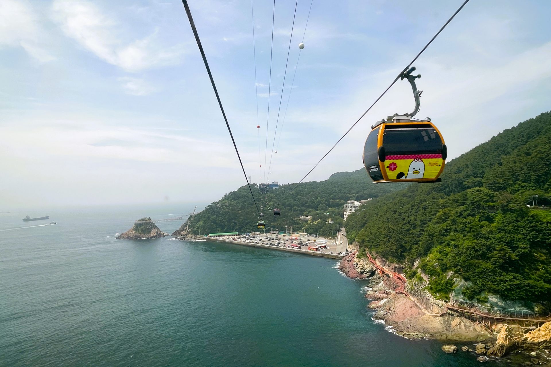 帰りは、約2.5km手前の青沙浦(チョンサポ)から尾浦(ミポ)まで最大4人乗りのスカイカプセルで。こちらは海雲台海辺列車の上空7~10mのレールを自動運行。ガイドさんのセッティングどおり、片道ずつ乗り分けてそれぞれの特長を楽しむのが正解でした。