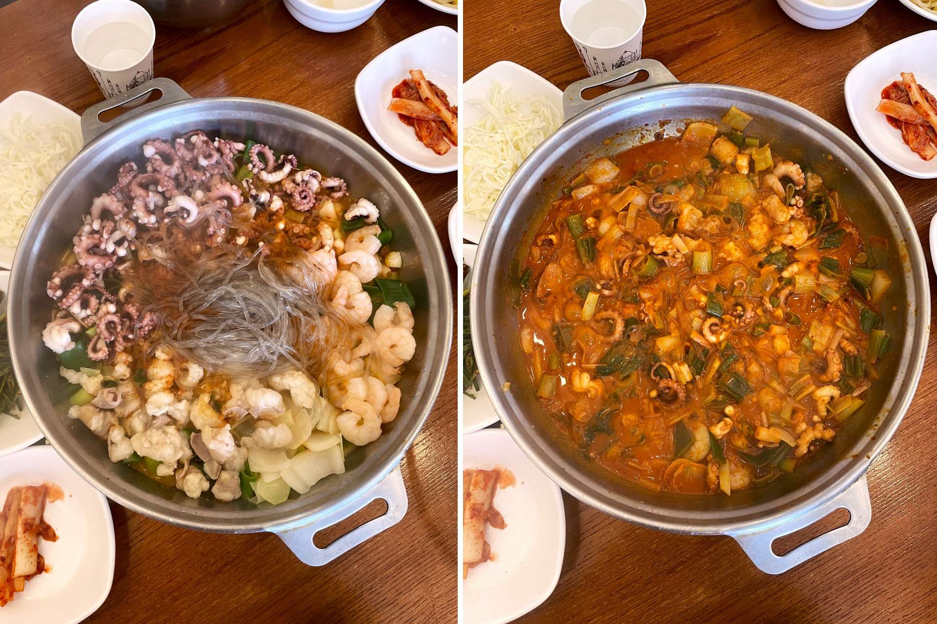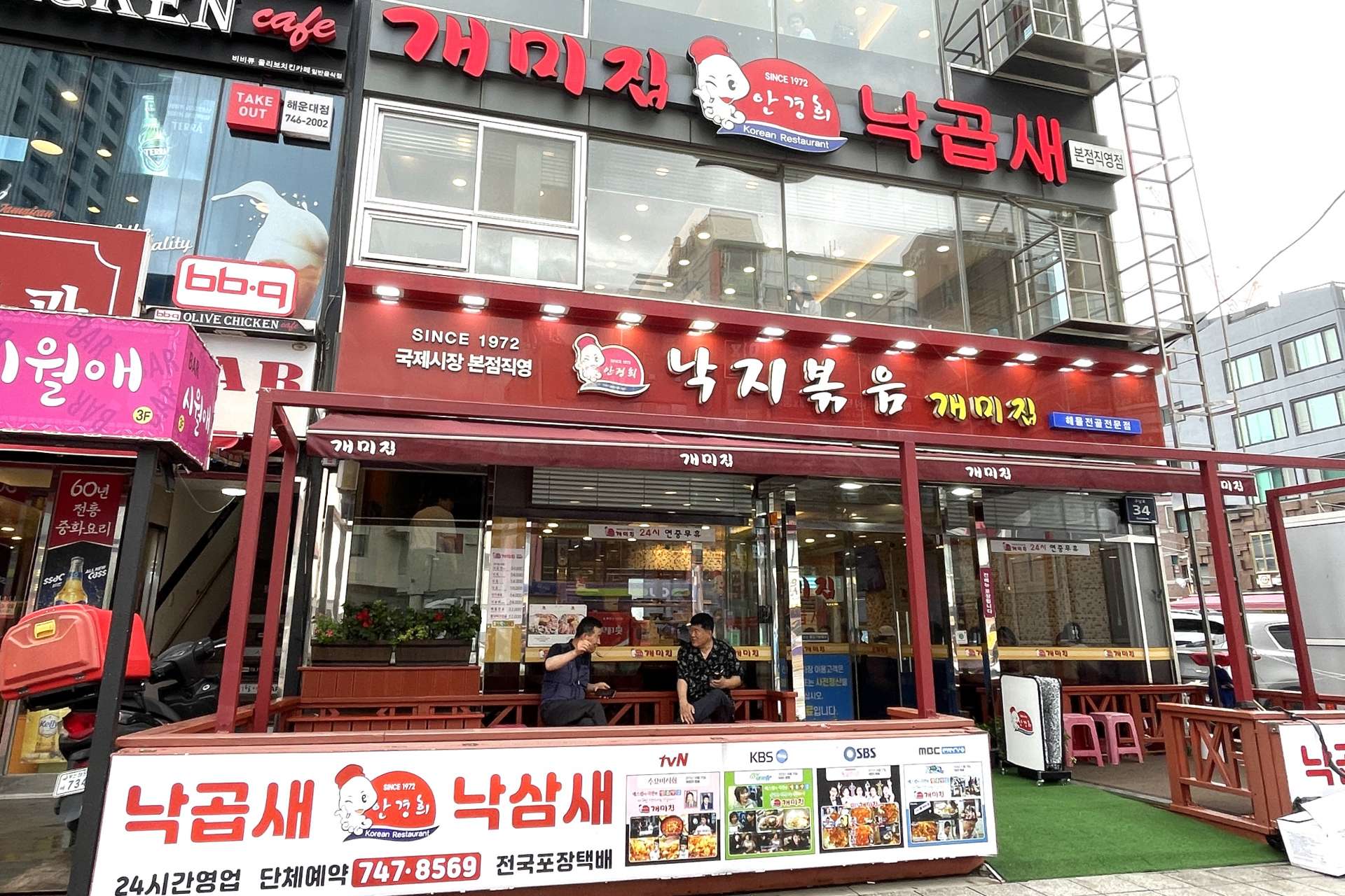 1軒目は釜山から韓国全土に広まった人気鍋のナッコプセ。手長タコのナッチとホルモンのコプチャン、エビのセウの頭文字をとって命名された料理で、具はこの3種がメイン。グツグツ煮込んで出来上がったらまずはそのままで。本来の味をしっかり堪能したら、ご飯にかけて食べるもよし、具が減ってきたらラーメンやうどんを入れてシメてもよし。辛いのが苦手だったら、注文時に辛さ控えめのリクエストを。