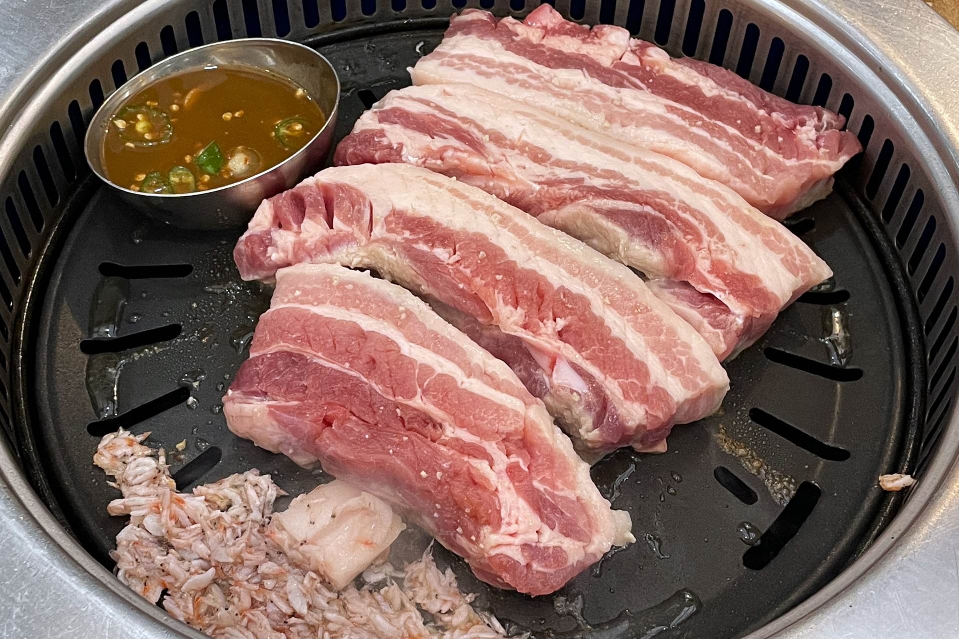 2軒目は釜山発ではなく、隣街の大邱(テグ)に本店を構える焼肉のチェーン店。釜山にも支店が複数あり、衝撃のおいしさだったので、紹介。メインは厚さ3.5cmに切ったサムギョプサルで、脂身が多いのが特徴。やわらかく甘みがあり、一緒に焼いたセウジョ(エビの塩辛)との相性も抜群でした。ここでのシメは香り豊かな山菜を載せた釜炊きご飯のトルソッパプ。今回はおなかがパンパンすぎておこげまでたどり着けなかったので、次回必ずリベンジします!