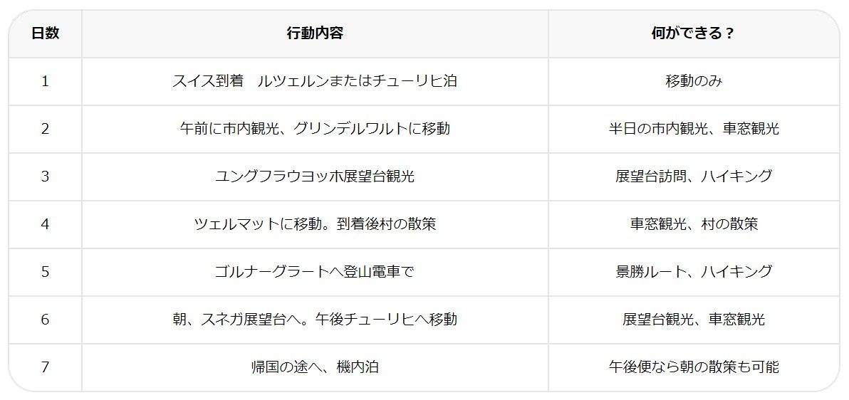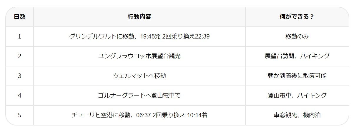 以前の直行便のフライトスケジュールでしたら、ユングフラウ地方とツェルマットに2泊ずつ滞在して4泊6日で旅することも可能でした。今はフライトに乗り遅れるリスクがあるのでおすすめできません。ユングフラウ地方2泊とどこか1都市の滞在でしたら可能ですが、その日程で旅を楽しめるかというと疑問です。どんなにタイトなスケジュールになるかは以下のタイムテーブルをご覧ください。飛行機が1時間遅れたり、どこかの区間で列車が遅れたりしたら目的地にたどり着けない危険満タンなプランです。