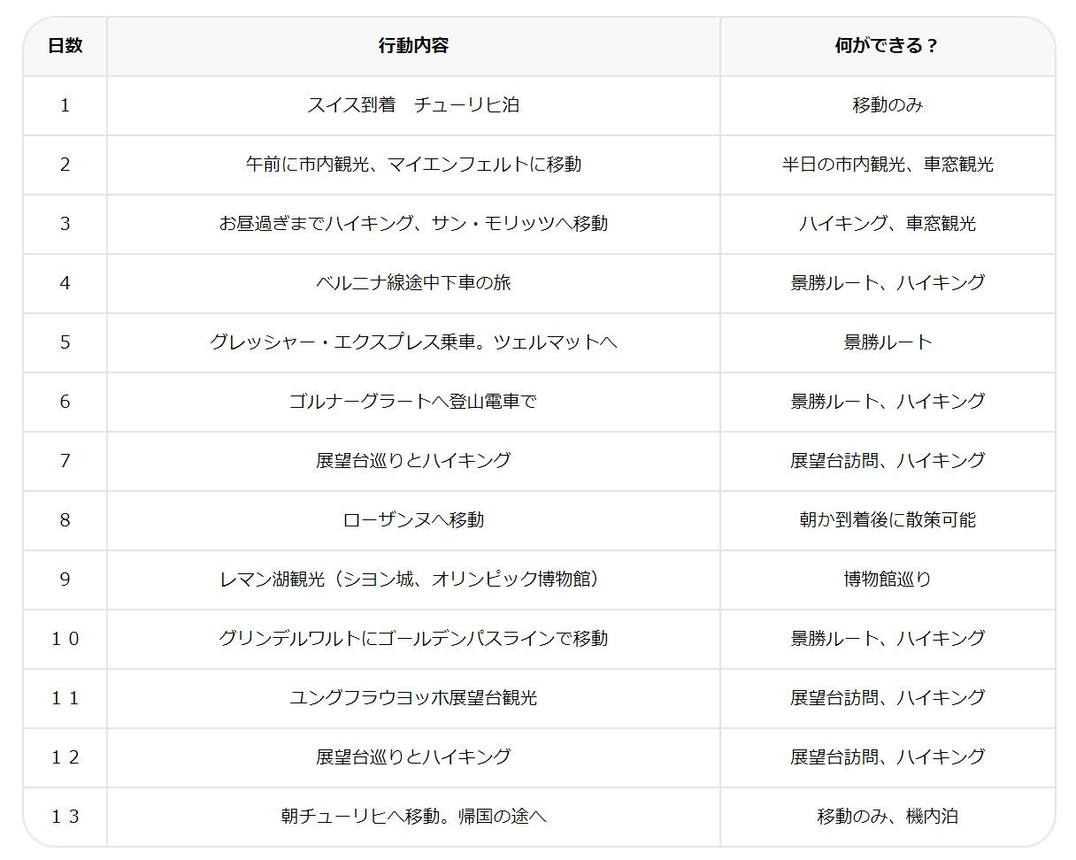 スイスは公共交通網がよく整っており、運行時間も正確ですので、日本同様に時刻表で組んだ旅プランをそのまま実行することが可能です。個人旅行のしやすさでは世界でもトップクラスの国と言っていいでしょう。スイス旅行を楽しむためには、いったい何日間の滞在が必要なのでしょうか。具体的な周遊プランを示しながらご紹介します。