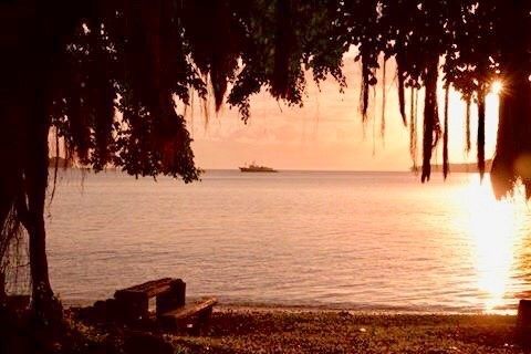 写真は、ポートビラ市街セントラルマーケット(市場)から、北へ10分ほど歩いた場所の夕景。ポートビラ湾に沿って遊歩道があり、木陰のベンチで夕景を眺める事ができます。近くにレストランも多く、その夕景を味わったあと、食事をしながらゆっくり余韻を楽しむこともできますよ。