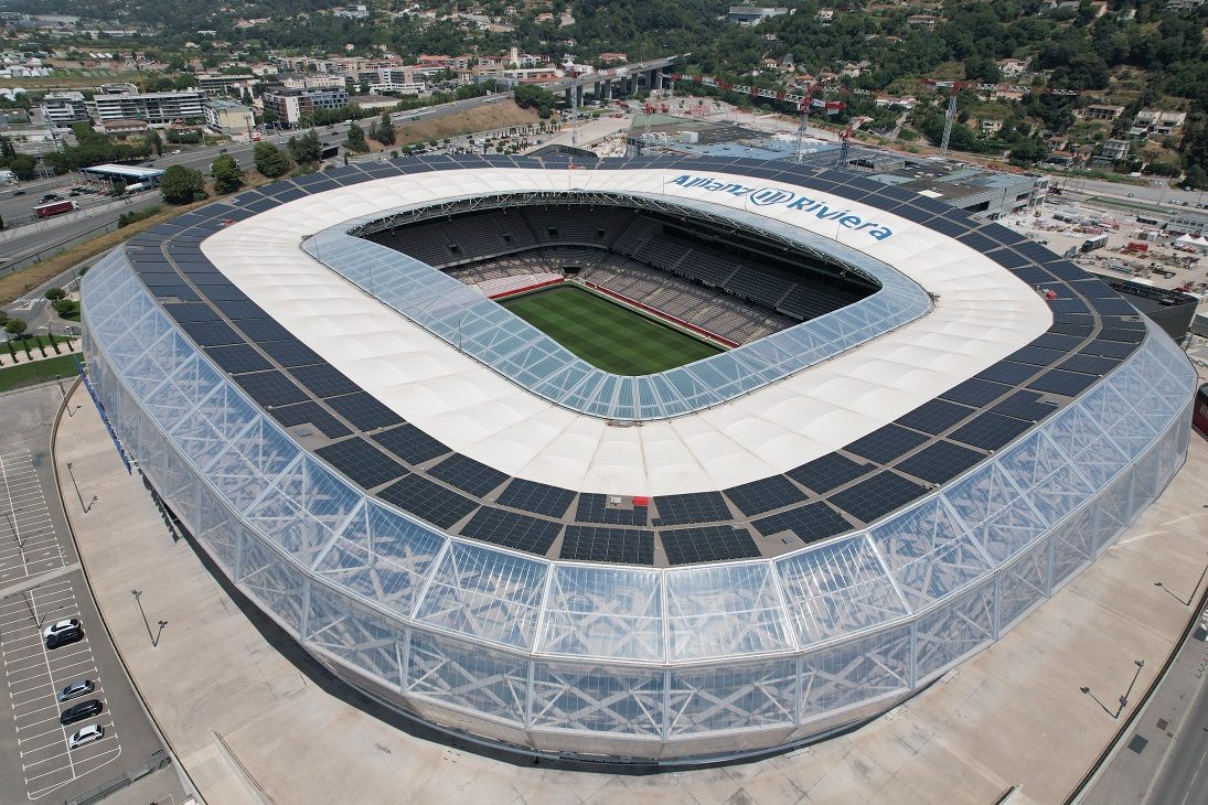 スタジアムはニース市内の北西に位置し、旧市街からはトラム2号線でスタジアムの最寄り駅サン・ティジドール(Saint-Isidore)までアクセスできます。2013年に建てられた「スタッド・ド・ニース」は、太陽光パネルや骨組みに木材を多用し、エコスタジアムとも称されています。貯水槽に溜めた雨水で芝生の水やりをしたり、トイレの水洗にも利用しているのだそう。
